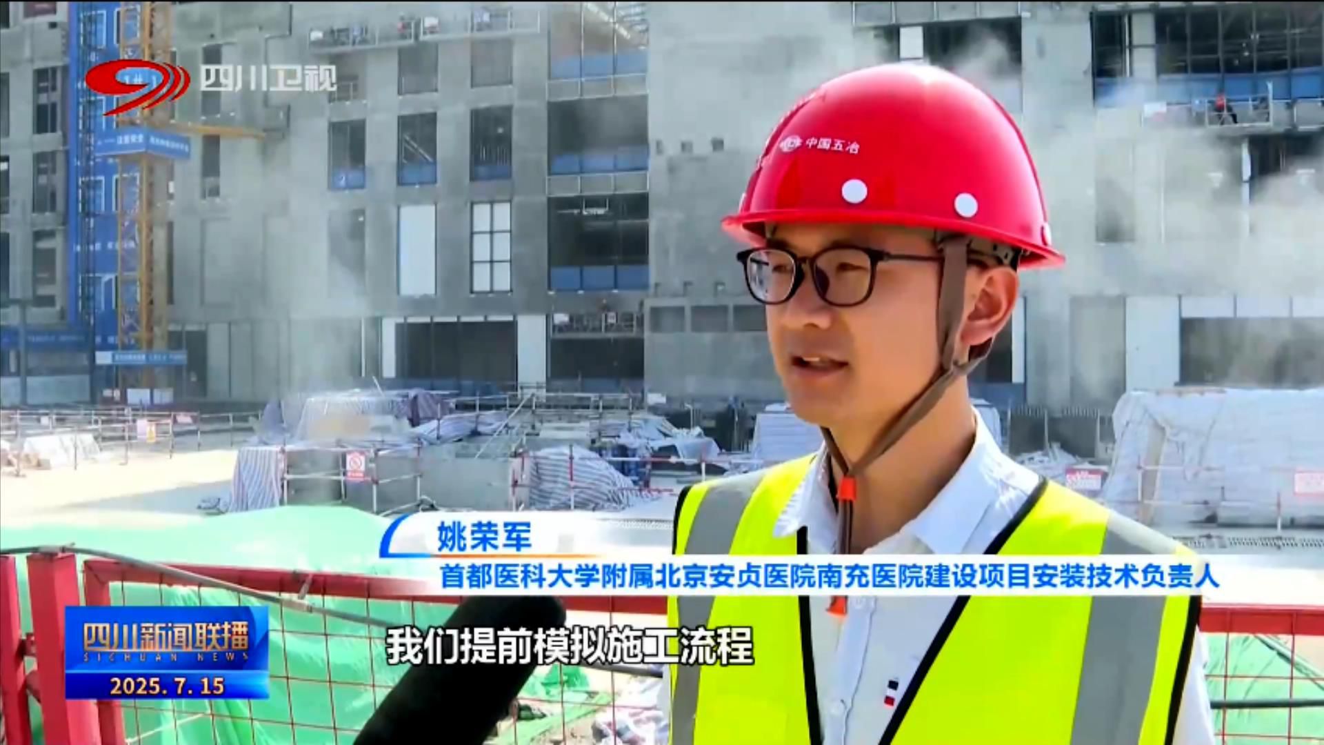 首都医科大学附属北京安贞医院南充医院建设项目安装技术负责人 姚荣军:我们提前模拟施工流程,优化各专业交叉作业顺序,减少现场返工和窝工。而新型喷雾降温系统覆盖主要施工区域,能将现场温度降低3-5℃。