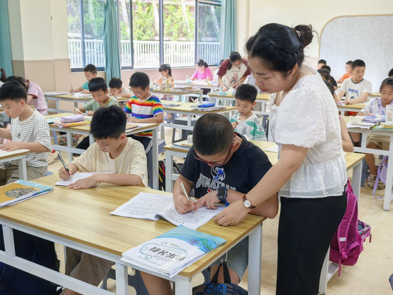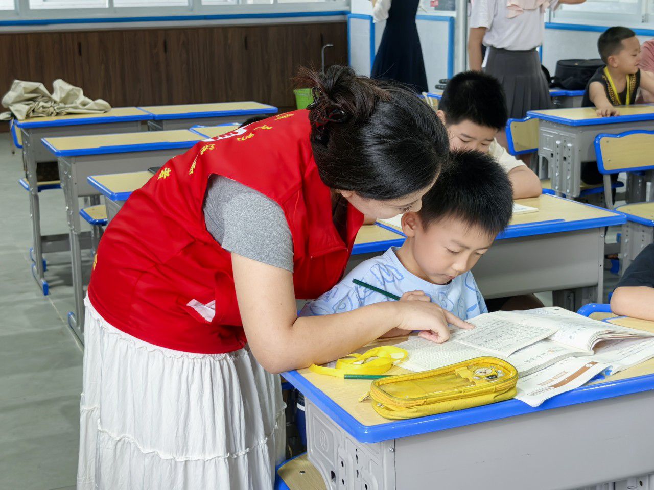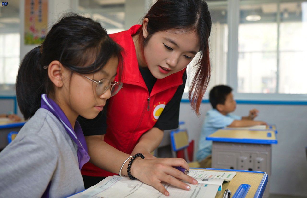 “蒋老师,这道数学题我做不来,您给我讲讲呢?”“好嘞,这道题应该……”教室内,蒋汶芳和田小雨弯下腰,一边拿着笔在书本上勾画,一边认真地用自己的专业知识为孩子们讲解暑假作业。