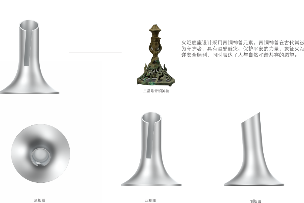 火炬底座设计则采用青铜神兽元素,青铜神兽在古代常被视为守护者,具有驱邪避灾、保护平安的力量,象征火炬传递安全顺利,同时表达了人与自然和谐共生的愿望。