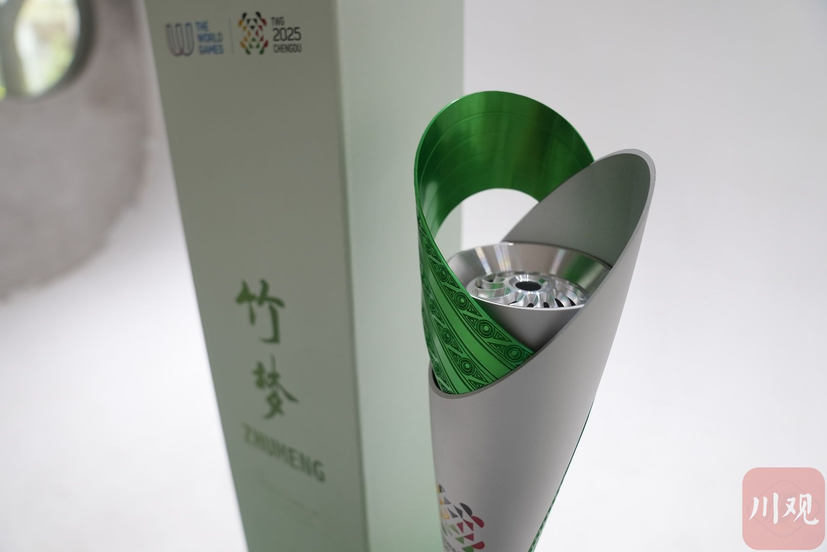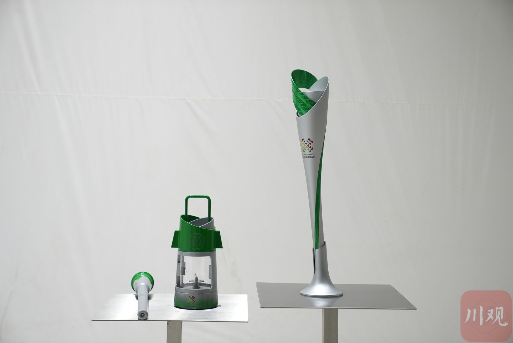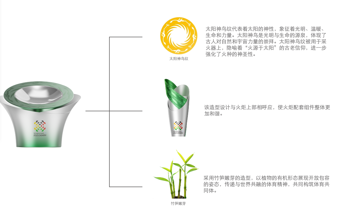 竹是四川最具有代表性的植物,也是成都世运会火炬的重要元素。记者看到在火种灯、火种盆、采火棒的顶部都用到了绿色,呼应火炬上的竹元素。