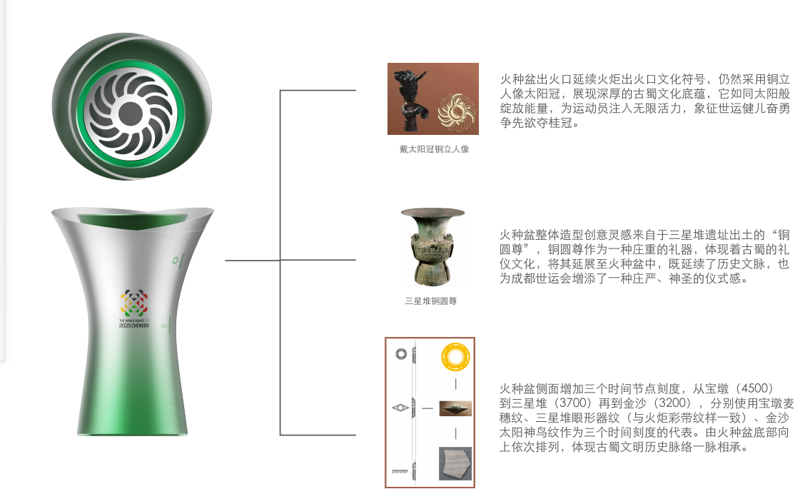 宝墩遗址博物馆学术馆长、副研究馆员唐淼介绍:“火炬及它的配套组件,融合了很多四川盆地、成都平原的文化元素,让文化和体育、文化和人类共同结合在一起,讲好成都平原的历史文化故事、现在的活力以及未来。”