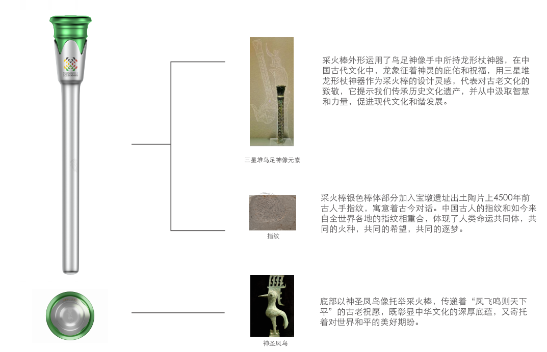 采火棒底部以神圣凤鸟像托举采火棒,传递着“凤飞鸣则天下平”的古老祝愿,既彰显中华文化的深厚底蕴,又寄托着对世界和平的美好期盼。