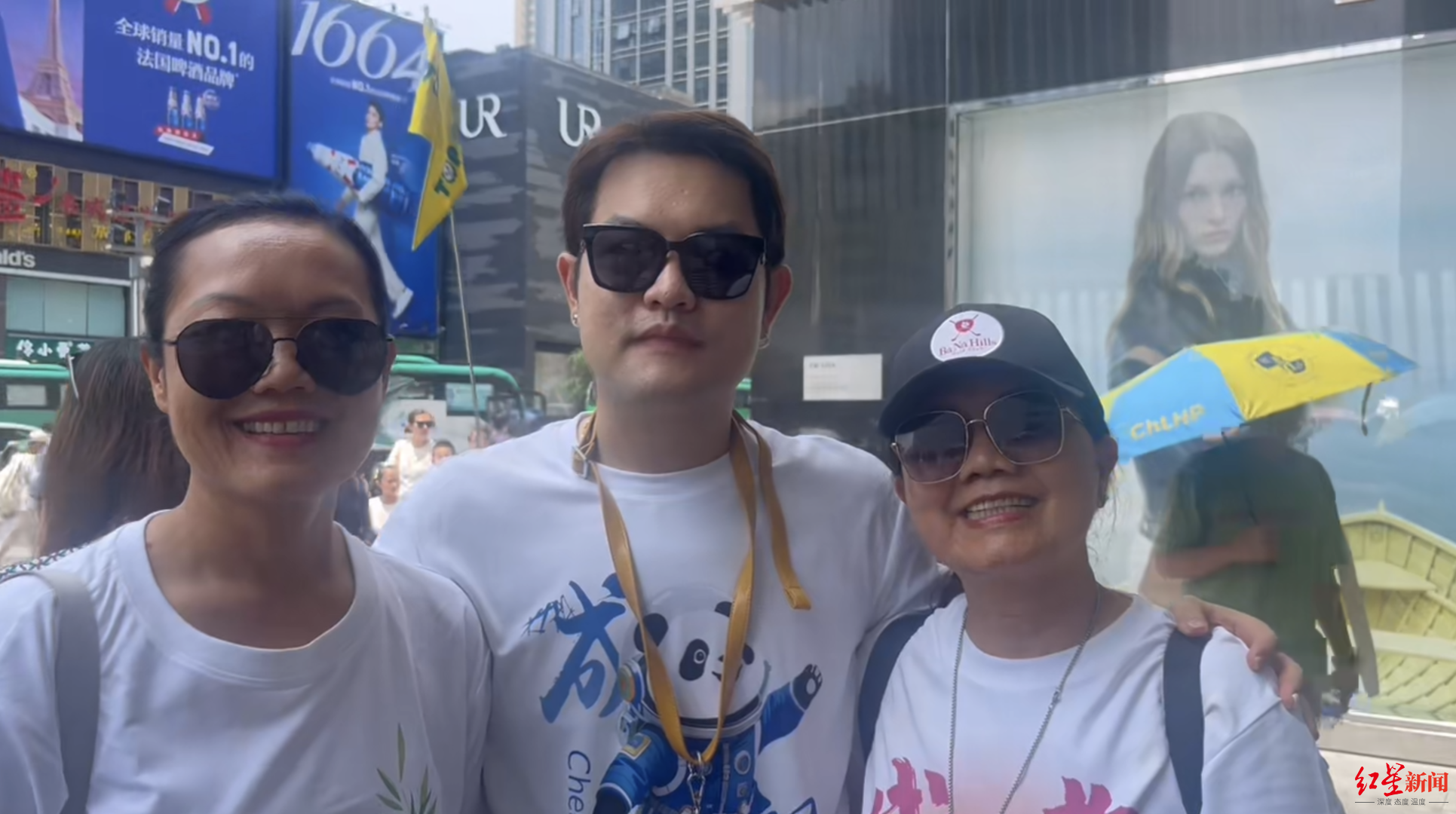 7月9日,第一次来中国的越南男孩钱胡(Tien Hgo)正和姐姐、母亲在春熙路逛街。三人穿着有大熊猫图案和成都字样的短袖,“我想要融入当地的文化,我忍不住穿上成都的服饰,展现出当地人的风范。”