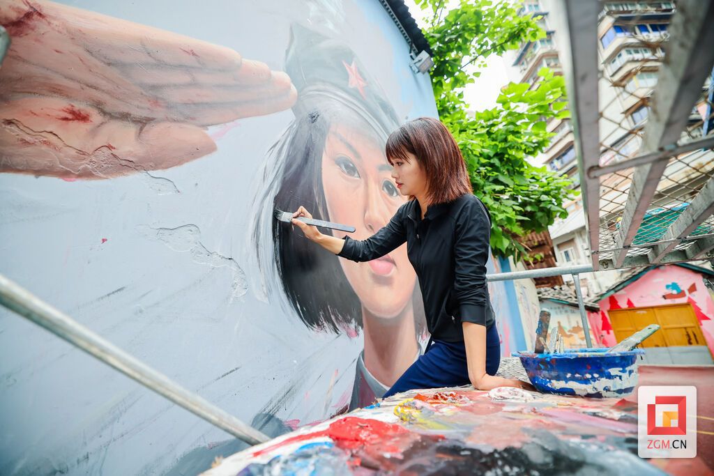 壁画不只是装饰。2025年7月初,“猫猫巷”一处墙面因渗水出现剥落。在进行修复时,杨慧莲创作了一整面写实风格的“女战士”壁画像,画面醒目处书写着“勿忘国耻 强我中华”。这幅寄托家国情怀的作品完工日恰在7月7日——“卢沟桥事变”爆发88周年,标志着中华民族全面抗战的起点。完工当天,年过七旬的退役老兵倪仁贵路过巷口时驻足良久,他告诉记者,打算回家穿上军装后再过来合张影、敬个礼。