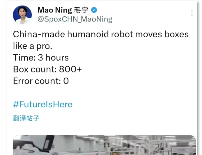 7月17日,中国外交部发言人毛宁在海外社交平台发布了一条“中国造”人形机器人在工厂里搬运箱子的短视频,引得海外网友纷纷点赞。