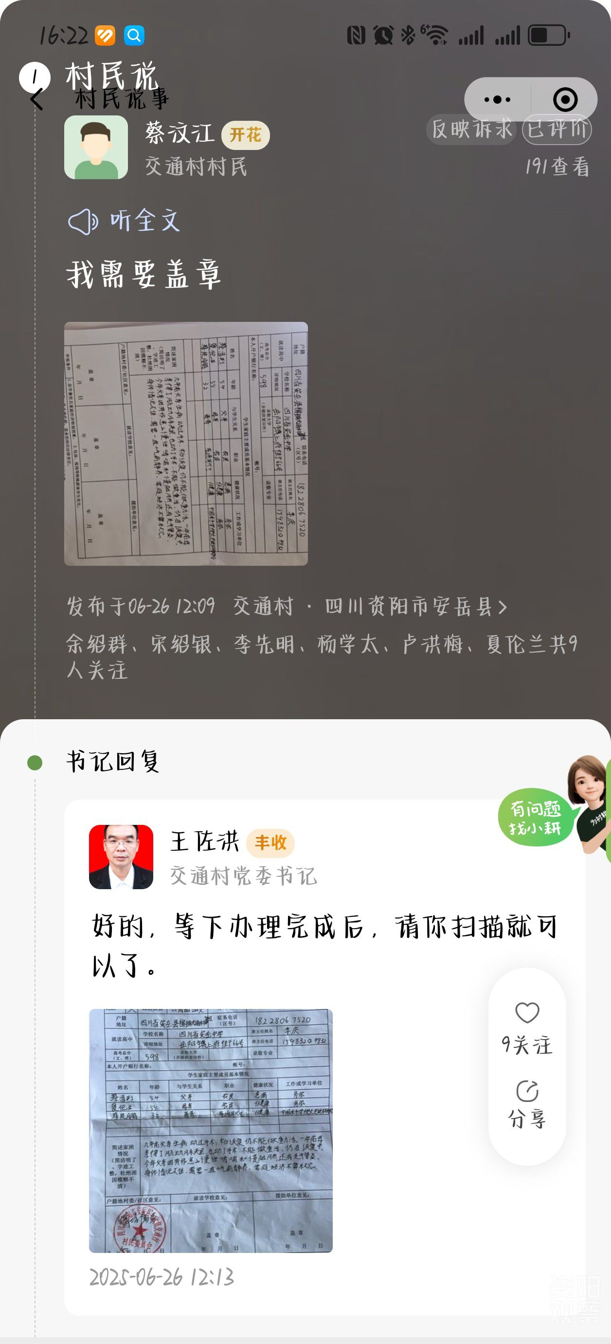 在浙江打工的汪胜果,业余时间为交通村设计了Logo。“看着村友圈里家乡的变化,也想做点啥。”这个Logo如今成了村庄的数字名片。外地上学的村民蔡汶江线上申请盖章,村干部4分钟就传来回执照片:“以前办事跑断腿,现在动动手指就搞定。”网络上“村民点单、干部接单”的高效响应,增强了村“两委”的凝聚力。
