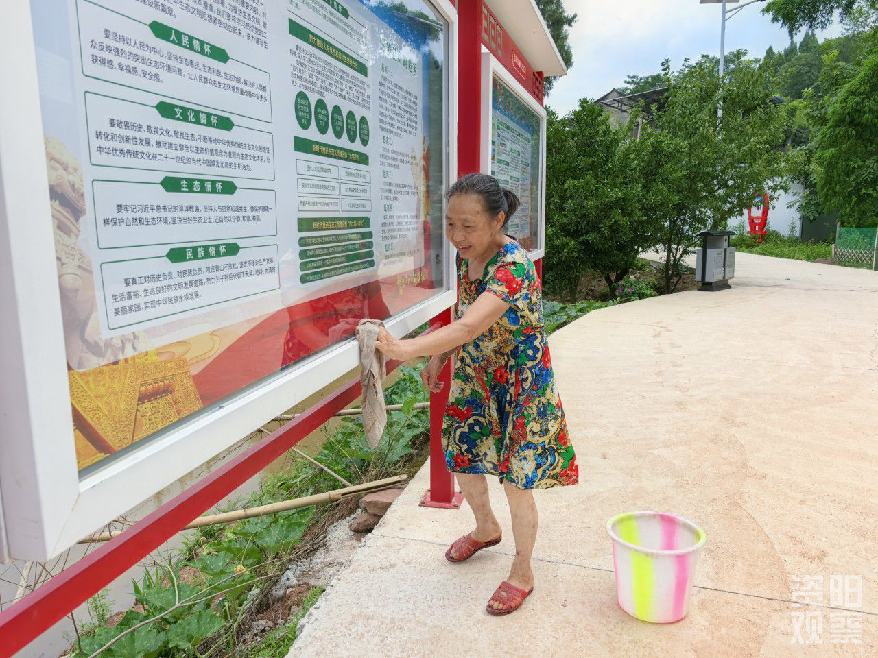 村民汪清秀正在擦拭门口的宣传牌。