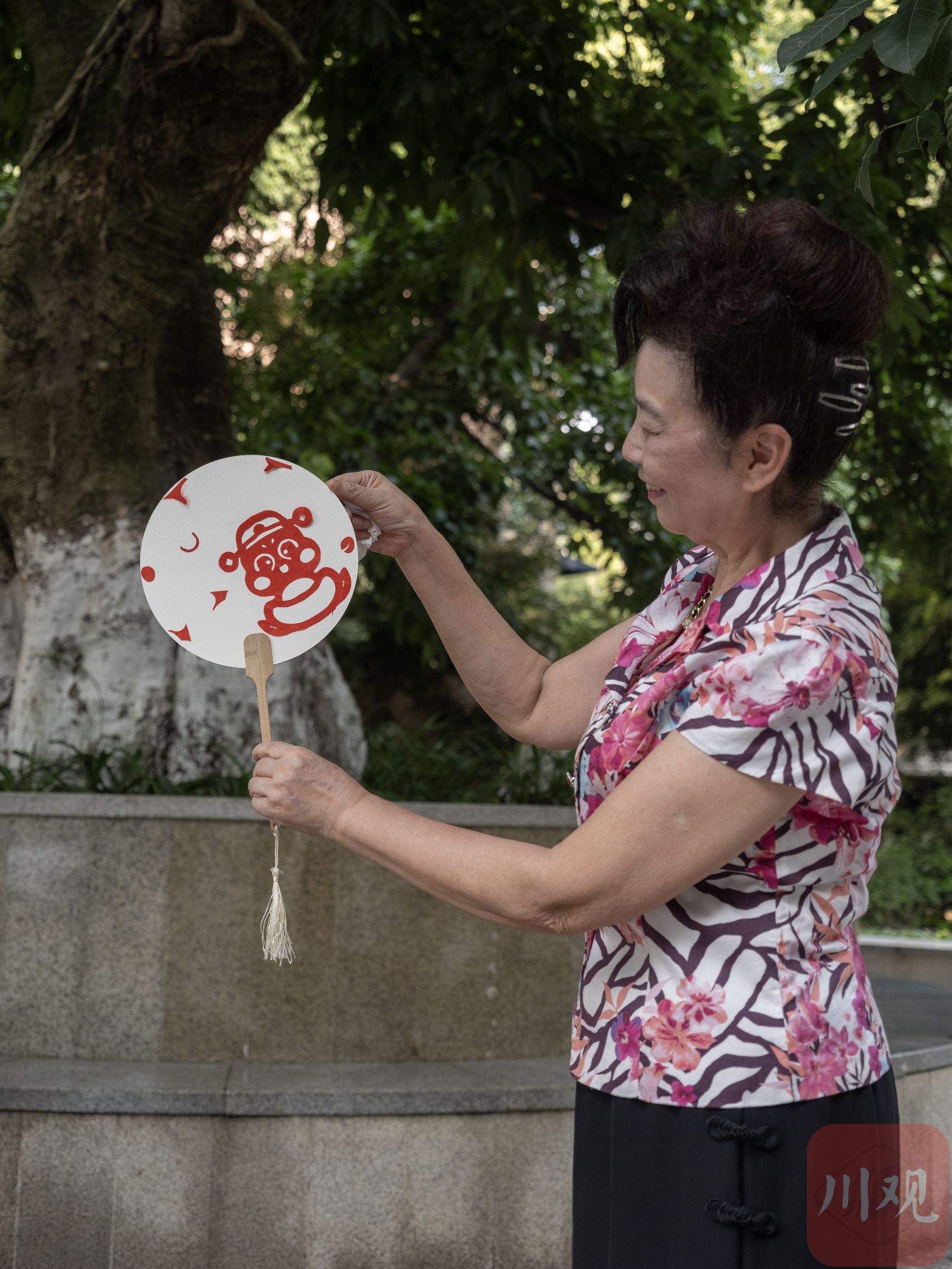 “共享奶奶”张惠英和孩子们做的剪纸扇。何涛 摄