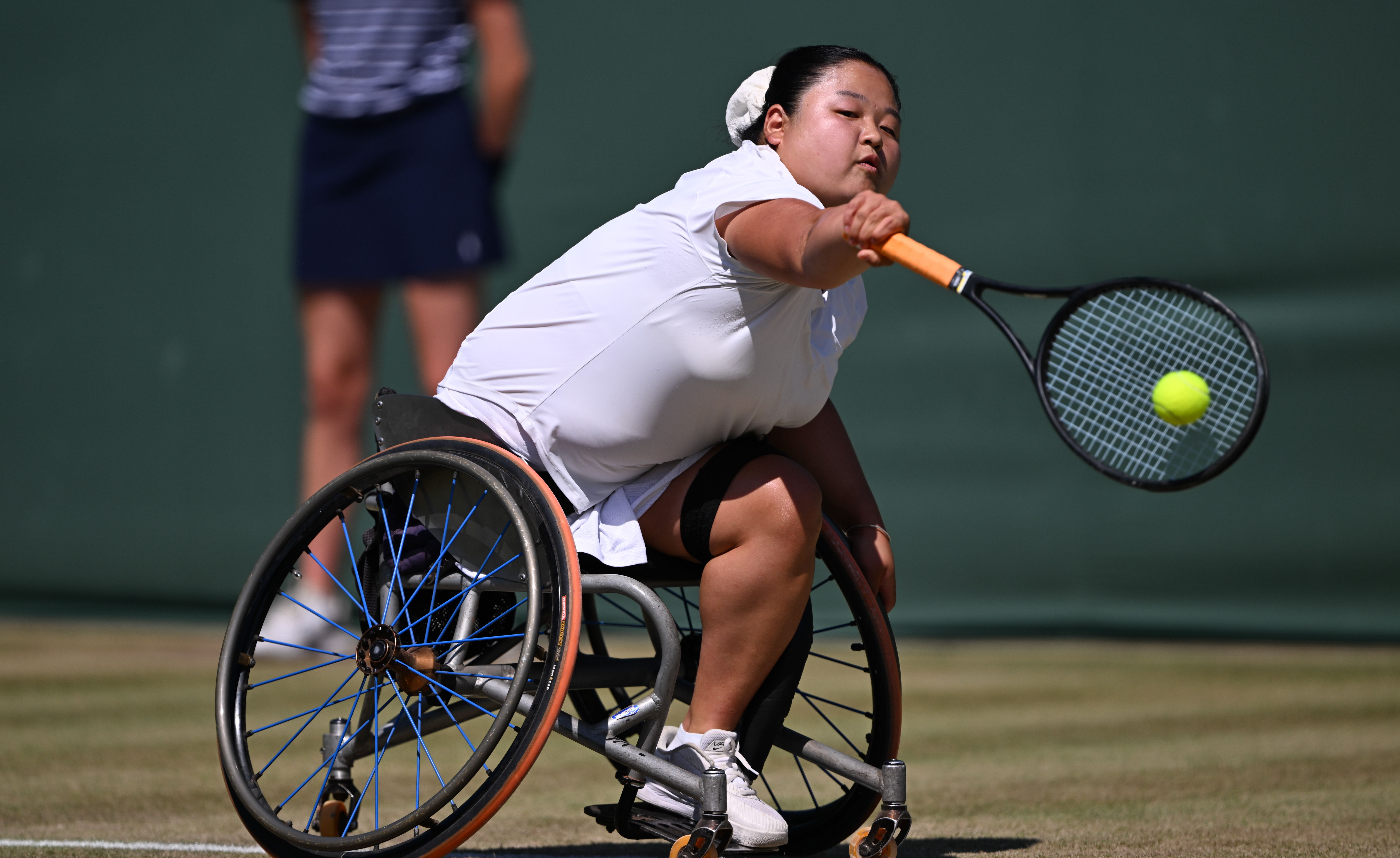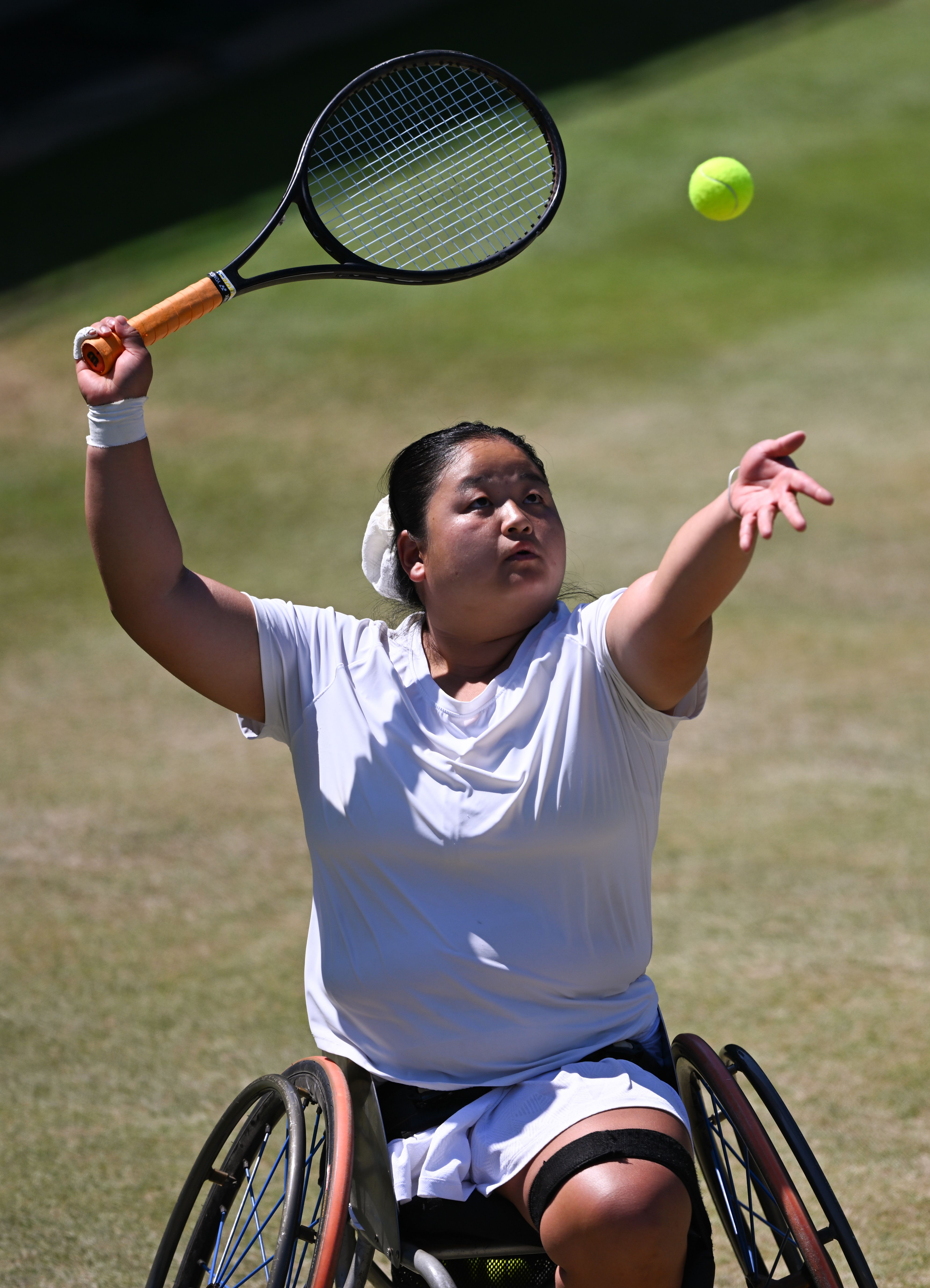 7月12日,王紫莹在比赛中回球。当日,在英国伦敦举行的2025温布尔登网球公开赛轮椅网球女单决赛中,中国选手王紫莹2比0战胜日本选手上地结衣,夺得冠军。新华社记者 李颖 摄