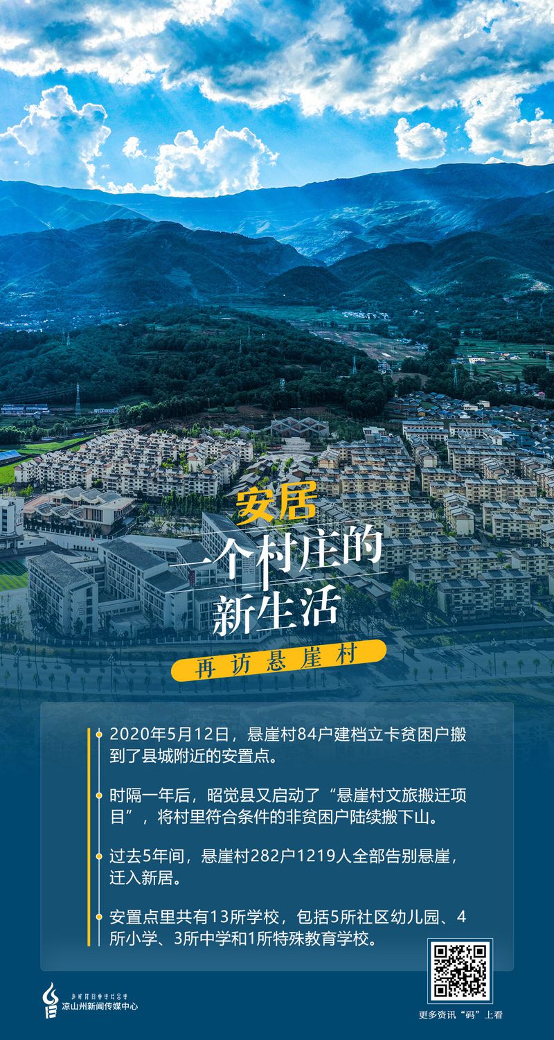 2020年5月12日,悬崖村84户建档立卡贫困户搬到了县城附近的安置点。时隔一年后,昭觉县又启动了“悬崖村文旅搬迁项目”,将村里符合条件的非贫困户陆续搬下山。过去5年间,悬崖村282户1219人全部告别悬崖,迁入新居。安置点里共有13所学校,包括5所社区幼儿园、4所小学、3所中学和1所特殊教育学校。
