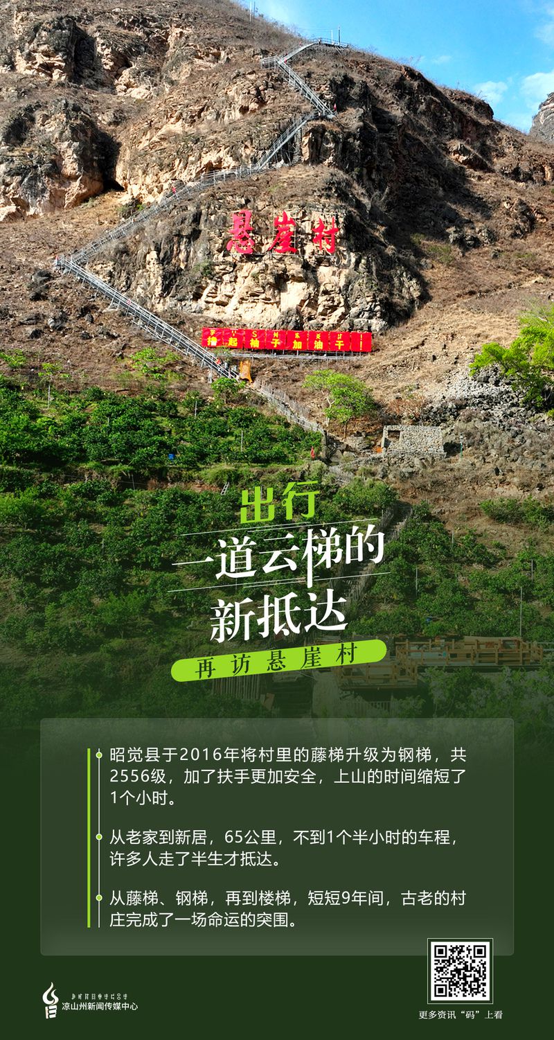 昭觉县于2016年将村里的藤梯升级为钢梯,共2556级,加了扶手更加安全,上山的时间缩短了1个小时。从老家到新居,65公里,不到1个半小时的车程,许多人走了半生才抵达。从藤梯、钢梯,再到楼梯,短短9年间,古老的村庄完成了一场命运的突围。