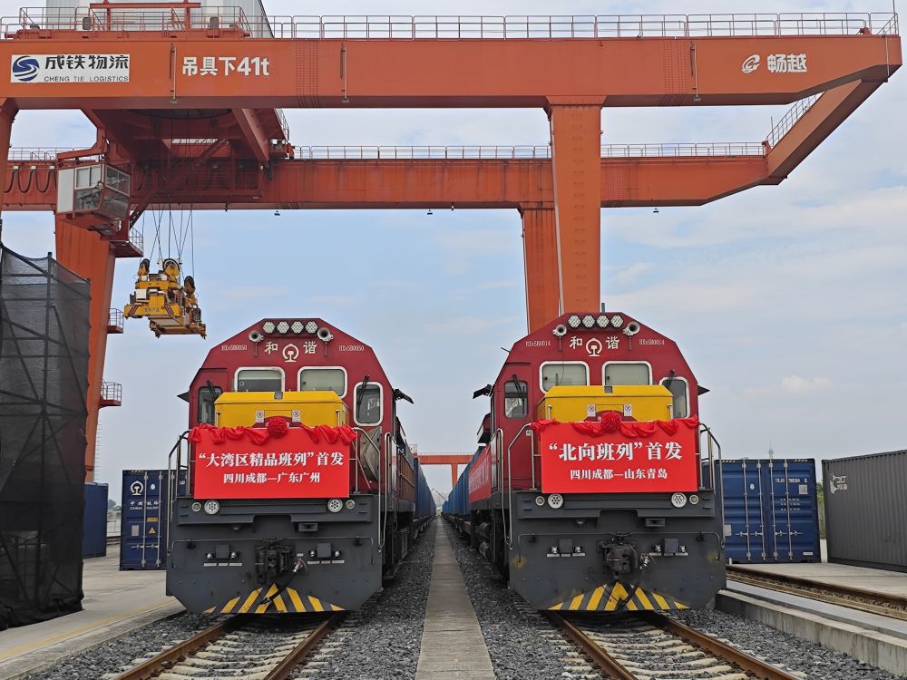 7月22日,两列满载元明粉、钛精矿的“北向班列”分别从四川成都、攀枝花启程前往山东青岛、淄博,装载电子设备、汽车零配件等货物的回程班列同一时间从青岛驶向成都;当日,两列“大湾区精品班列”也于四川成都和广东广州实现双向首发。