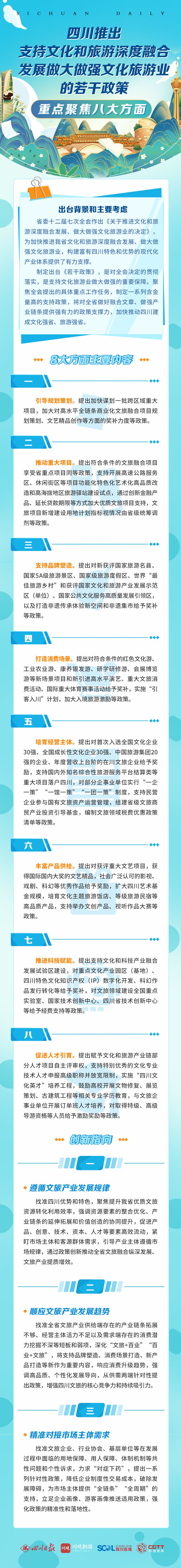 7月22日,记者从四川省文化和旅游厅官方网站获悉,省委办公厅、省政府办公厅日前印发的《关于支持文化和旅游深度融合发展做大做强文化旅游业的若干政策》,从围绕引导规划策划、推动重大项目、支持品牌塑造等8个方面,推出了一系列含金量高的支持政策,对全省做好文旅深度融合文章、做强产业链条提供强有力的政策支撑力。