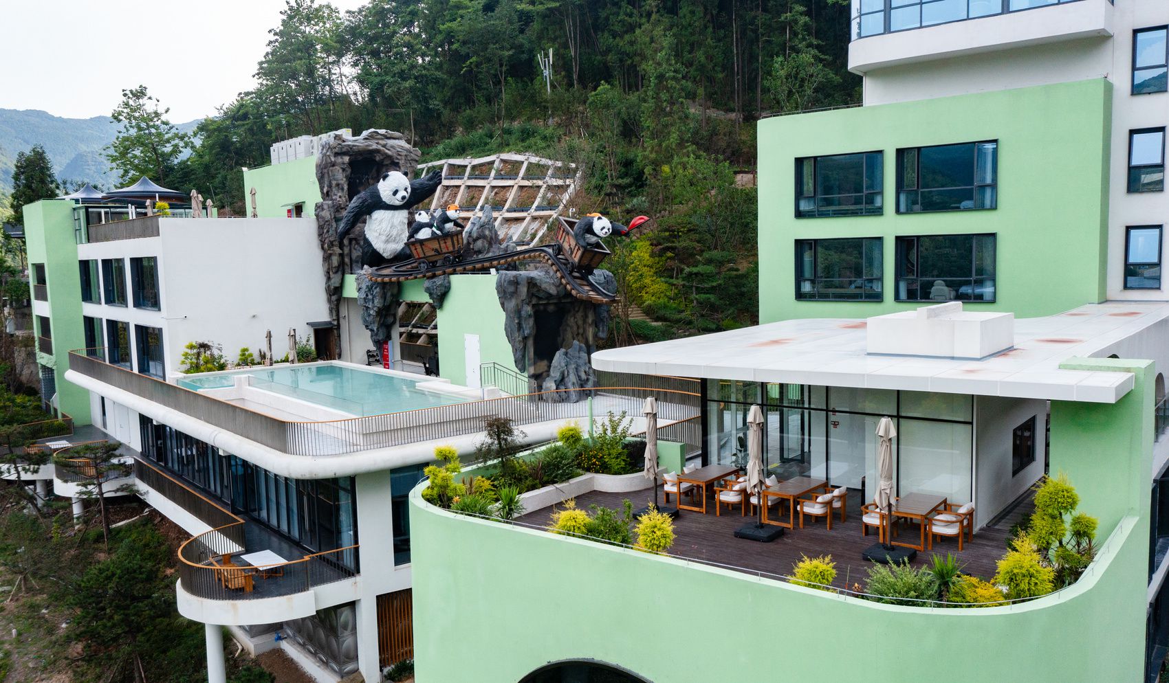 站在酒店的观景平台往下看,林木植被郁郁葱葱。 “作为当地科普教育基地,华蓥山大熊猫苑已引入‘林溪’‘一家’两只熊猫,成为本地生态旅游的标志,我们主动关联这一IP,将熊猫形象与矿山改造深度绑定。”该民宿区域运营负责人韦超说。