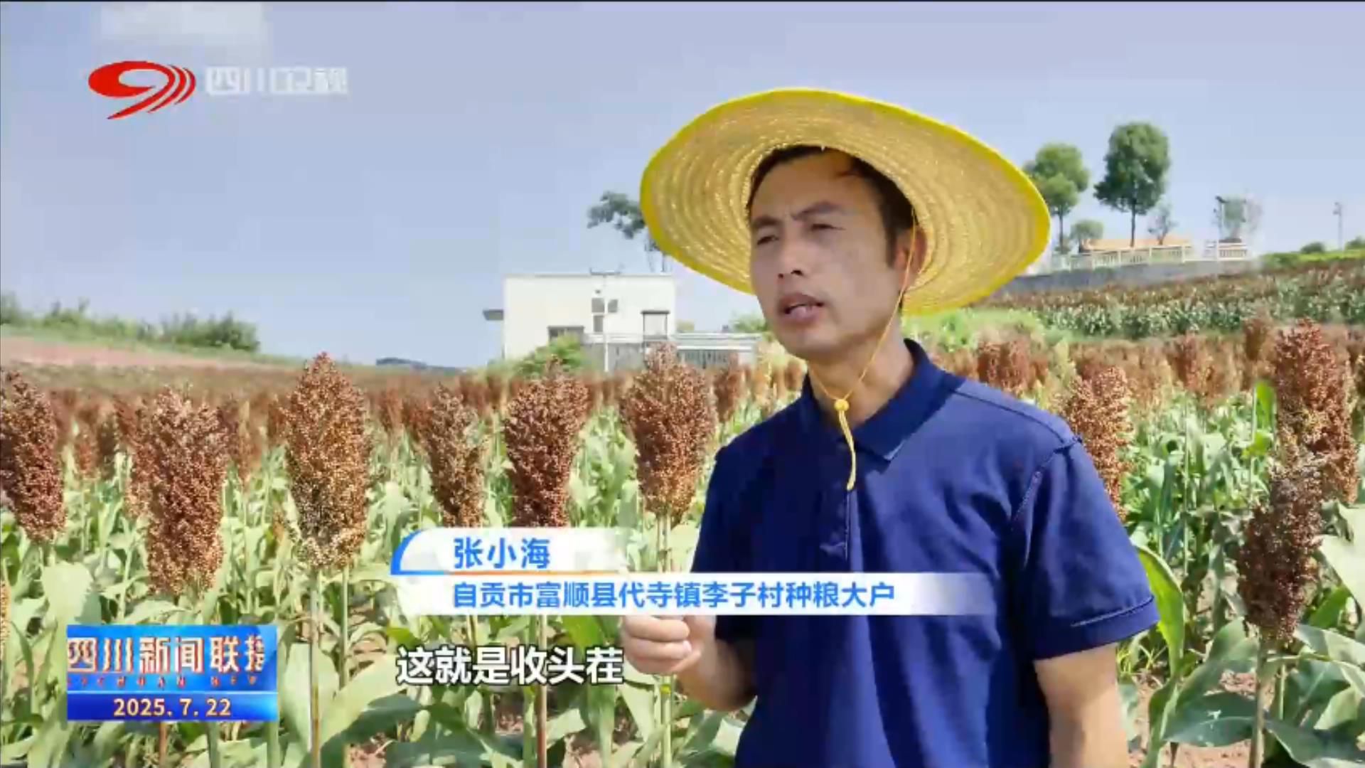 自贡市富顺县代寺镇李子村种粮大户 张小海:这就是收头茬,然后头茬收了之后蓄再生高粱,再套种大豆,然后在10月份再收高粱。两季收割(亩产)可达到1200斤,高粱还不愁销。