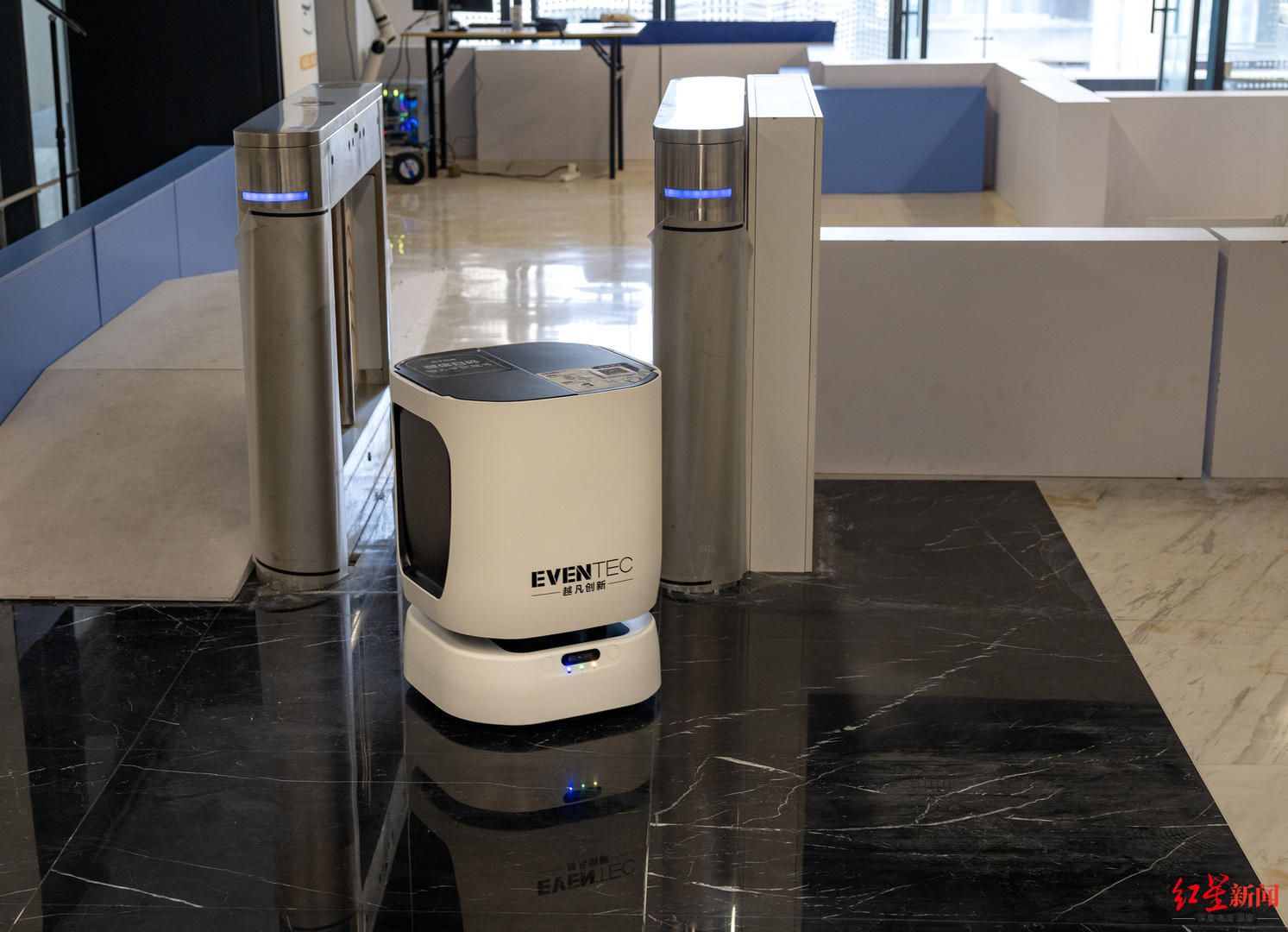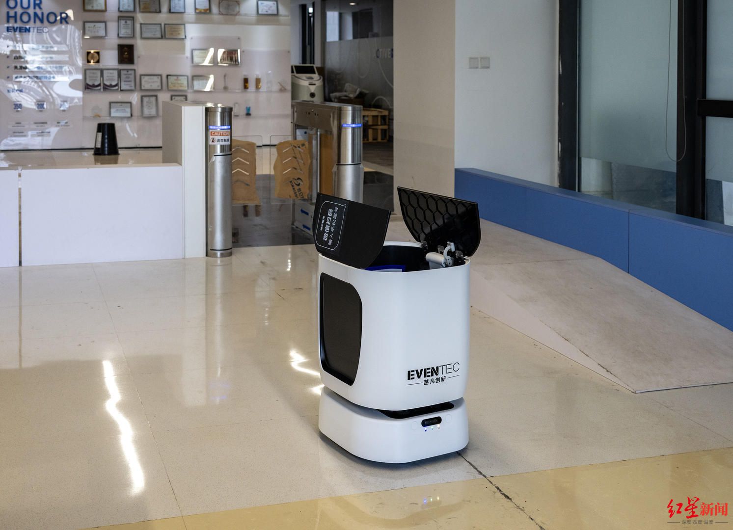 和我们在酒店常见的末端物流配送机器人不同,刘翔介绍说,所有机器人的“大脑”,即完全自主研发的导航算法系统是其核心竞争力。它让机器人能在超大空间(如园区)、复杂人流中自主规划路径,“像人一样定位和思考”。越凡还攻克了机器人自主通行电梯、闸机的行业难题,其自研的AIOT(物联模组)方案已向行业赋能。