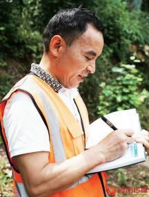 穿过银色的被动防护网,他的身影很快隐没在葱郁的山林中,只有脚下不时溅起的山泉水打破林间的寂静。大约十分钟后,涂永全在一块巨石面前停下了脚步,他利落地挥动着弯刀,俯身割开茂密的杂草,查看巨石与泥土的缝隙,然后掏出记录本,在灾体异常变化情况表一栏中,填写下“无变化”。