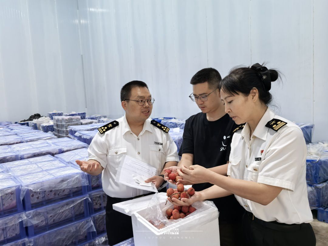 7月25日,在泸州市合江县荔江镇合江中荔农业发展有限公司,清晨四五点从出口果园采摘回来的新鲜荔枝,经过分拣、精选、预冷等环节后,进入3°C恒温冻库冷藏。上午10时许,两名泸州海关关员进入保鲜库,对即将出口的带绿荔枝抽样送检,并向企业介绍水果出口便利化措施,全力支持合江荔枝出口。