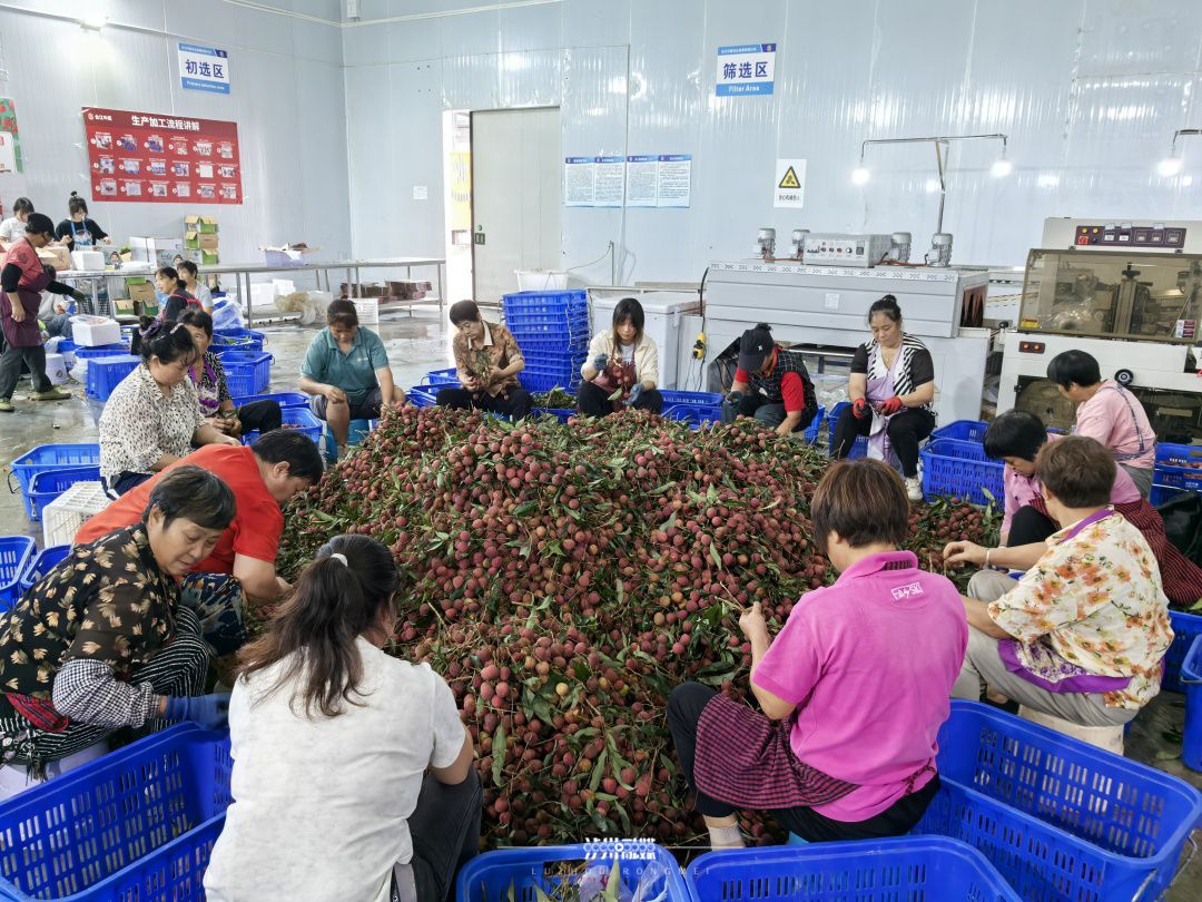 分拣加工车间里,90名分拣工围坐在一堆堆小山似的鲜荔枝前进行初拣。为避免损伤果粒,分拣工将果枝进行人工分离,去枝后留下一颗颗果粒,同时筛选出烂果、坏果、虫果。