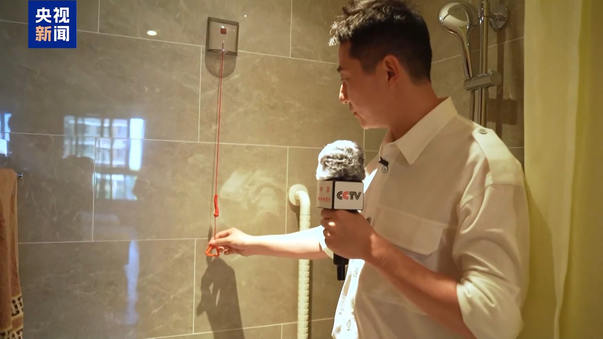 拉绳报警器,老年人在洗澡的时候可以把它套在手上或者系在自己的身上,如果意外摔倒把它拽出来,报警器会连到服务台。