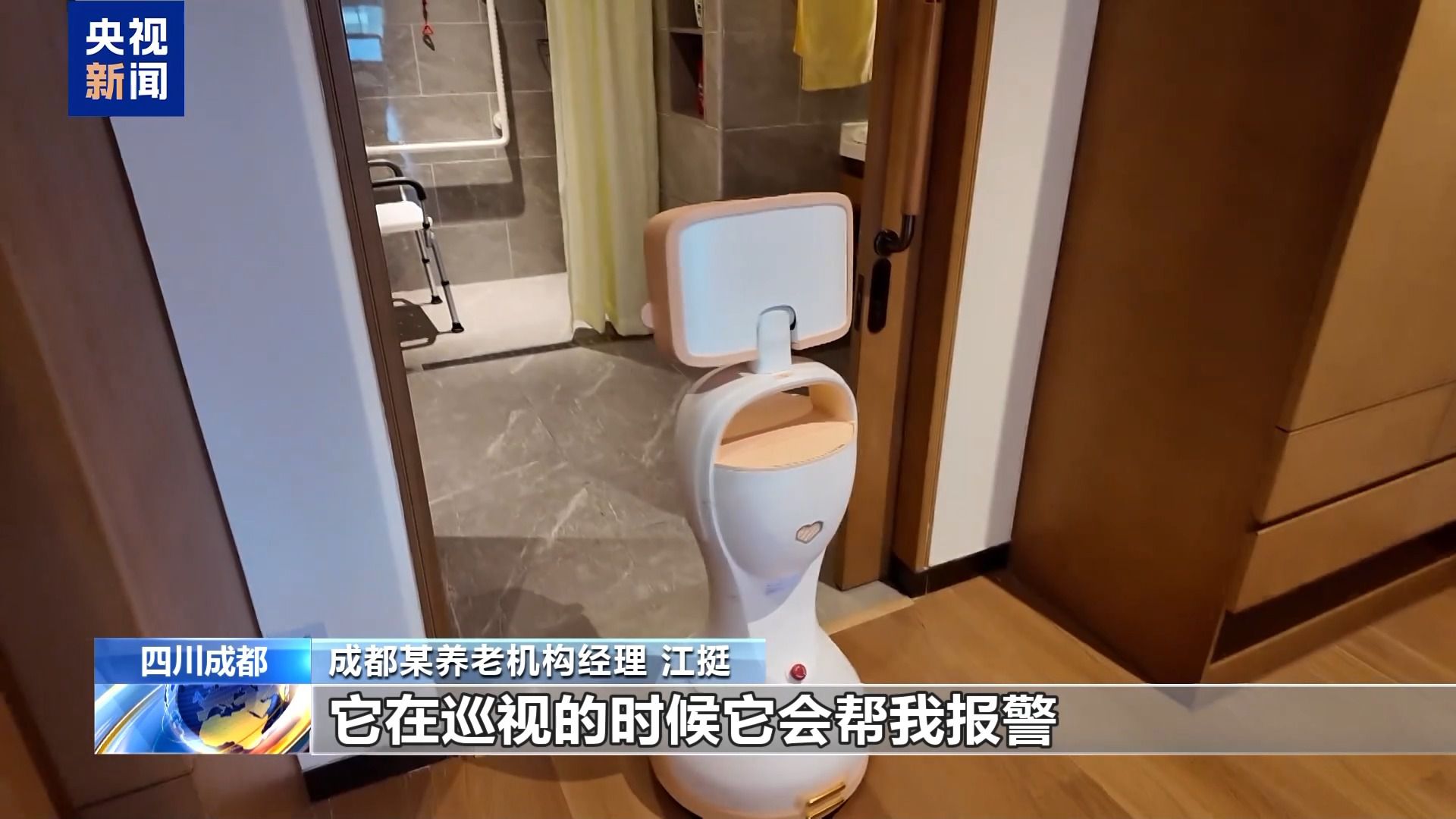 成都某养老机构经理 江挺:在我们这里进行安全巡视,我们目前给它设定的是每半个小时把整个房间巡一次,如果我不小心摔倒在地上,而且出现了昏迷的状况,没有办法呼救,它在巡视的时候会帮我报警。
