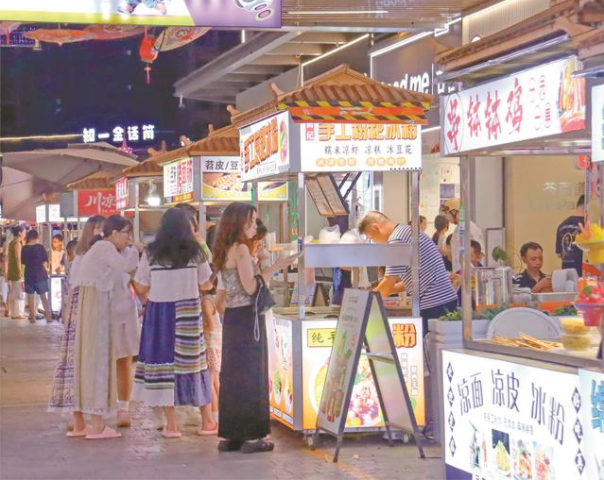 7月26日晚,加德天街广安夜间经济示范街灯火斑斓,创意招牌下的摊位前人头攒动。年轻店主们举起手机直播,镜头里刚出锅的盘鳝嗞嗞作响,弹幕里“想来广安逛夜市”的留言不断。在吾悦新印巷,各色招牌下的摊位前人头攒动。冰粉、凉糕的沁凉清爽与烤串的烟火气挑逗着味蕾,为夏夜消费再添热力。夜色渐浓,欢笑声与碰杯声仍交织成一片,将这份热闹延续至深夜。