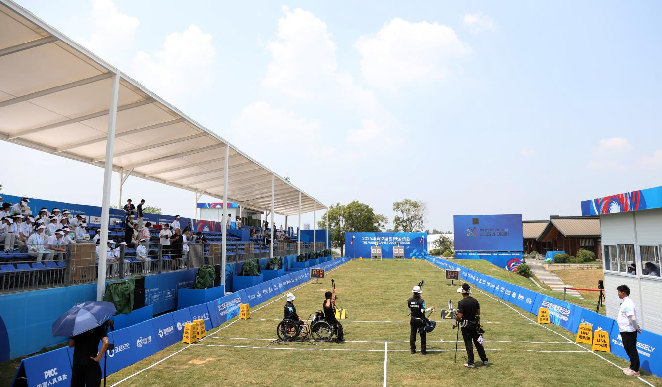 走进赛场内部,“简约、安全、精彩”办赛理念藏在每个细节里。“利旧率达95%以上!”射箭场馆中心相关负责人介绍,团队秉持“简约、安全、精彩”办赛理念,最大程度保留公园原有的建筑装修风格和自然景观,仅根据赛事需要对内部功能设施进行调整。室外临建篷房、看台区等设施设备全部采用租赁方式,赛后将进行回收利用,最大程度减少对公园绿地的影响。