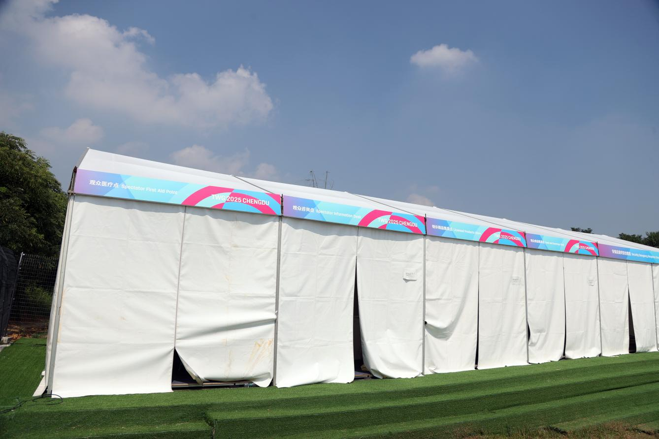 如今,场馆现已全面进入“临战状态”——人员流线已明确,临建篷房包括媒体转播间、运动员休息室、更衣间及观众医疗点、观众咨询点、特许商品售卖点、食品售卖点、移动厕所等已全部呈现。从检票口到观赛区,均配备安保组、医疗组、志愿者等人员提供保障服务;看台区,遮阳棚、大风量电扇等设施设备已安装,赛时还将为观众提供“防暑降温包”。“从运动员热身区到观众休息凳,每个角落都过了几遍流程。”该相关负责人说。