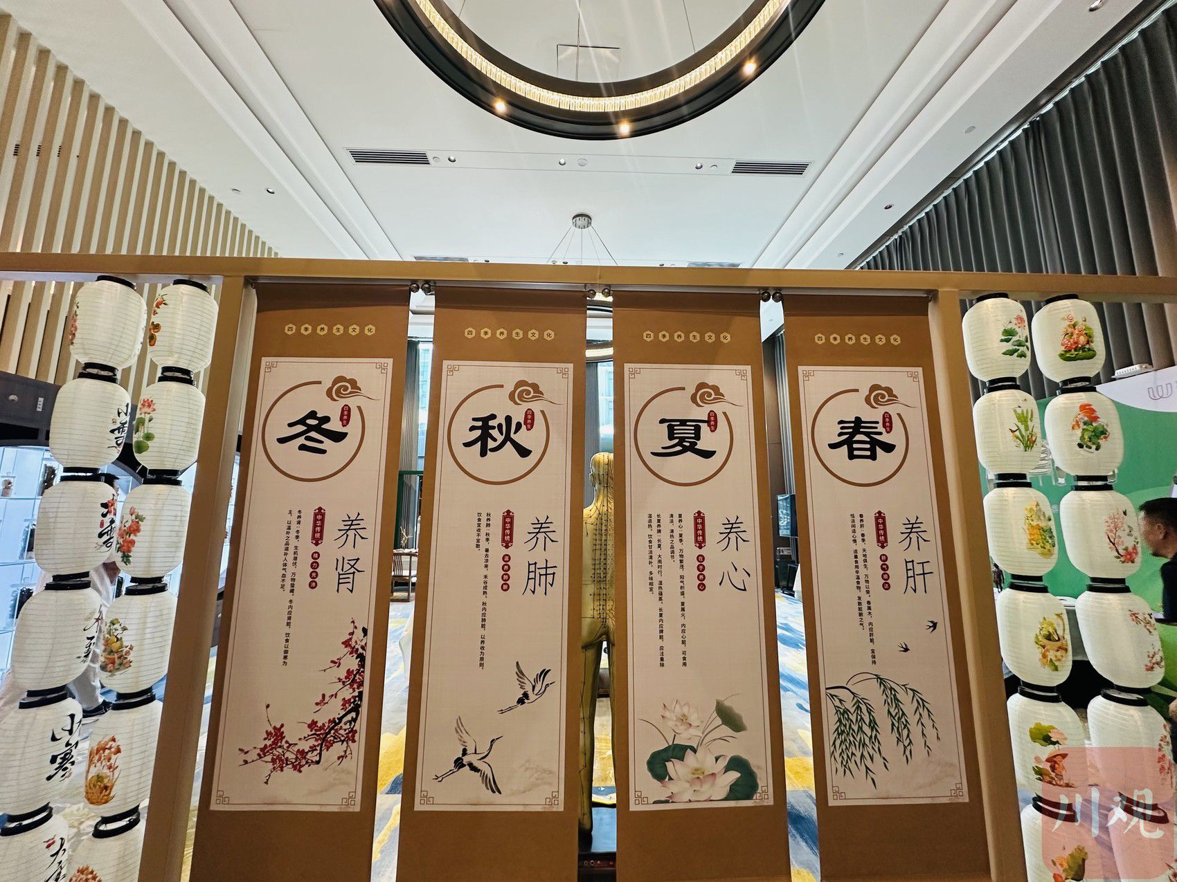 步入不远处的中医药体验馆,药香袅袅,沁人心脾。这里不仅是展示中国传统医药文化的窗口,更是一个充满互动体验的活力空间。记者见到,盛满中草药的瓶瓶罐罐陈列满墙,清晰标注着产地与功效;天回医简、擂钵、漆耳杯仿制品整齐陈列,彰显中医药悠久历史;熬药、摇丸、制丸、制贴,一幅幅图示生动呈现中药制作全流程。“访客可亲手制作草药香囊,或体验传统艾灸锤制作,制作完成的工艺品可以带走,留作纪念。”中医药体验馆驻场工作人员李凯文介绍。