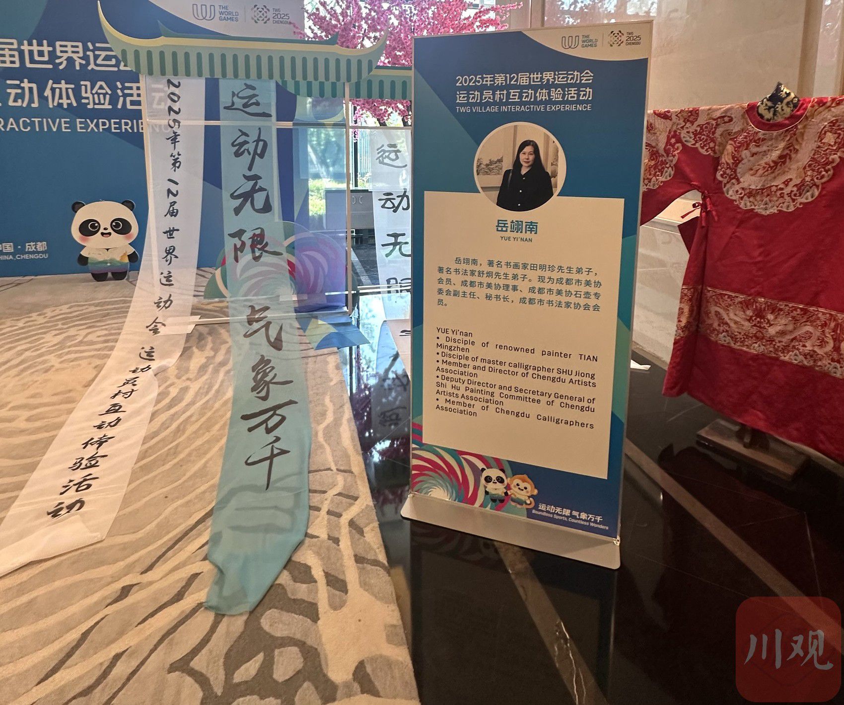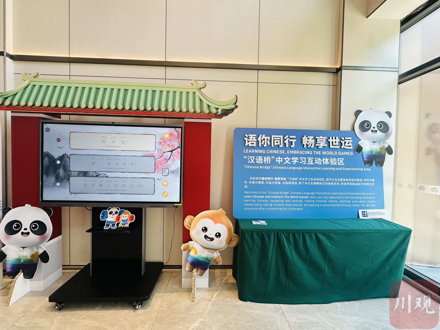 此外,世运村还设有“汉语桥”中文学习互动体验区。该体验区的运营负责人安晓宁介绍,这里由教育部中外语言交流合作中心和成都大学联合为运动员们带来生动有趣的中文学习体验,感兴趣的各位运动员可在此学写中国字、取个中文名、学画大熊猫等。