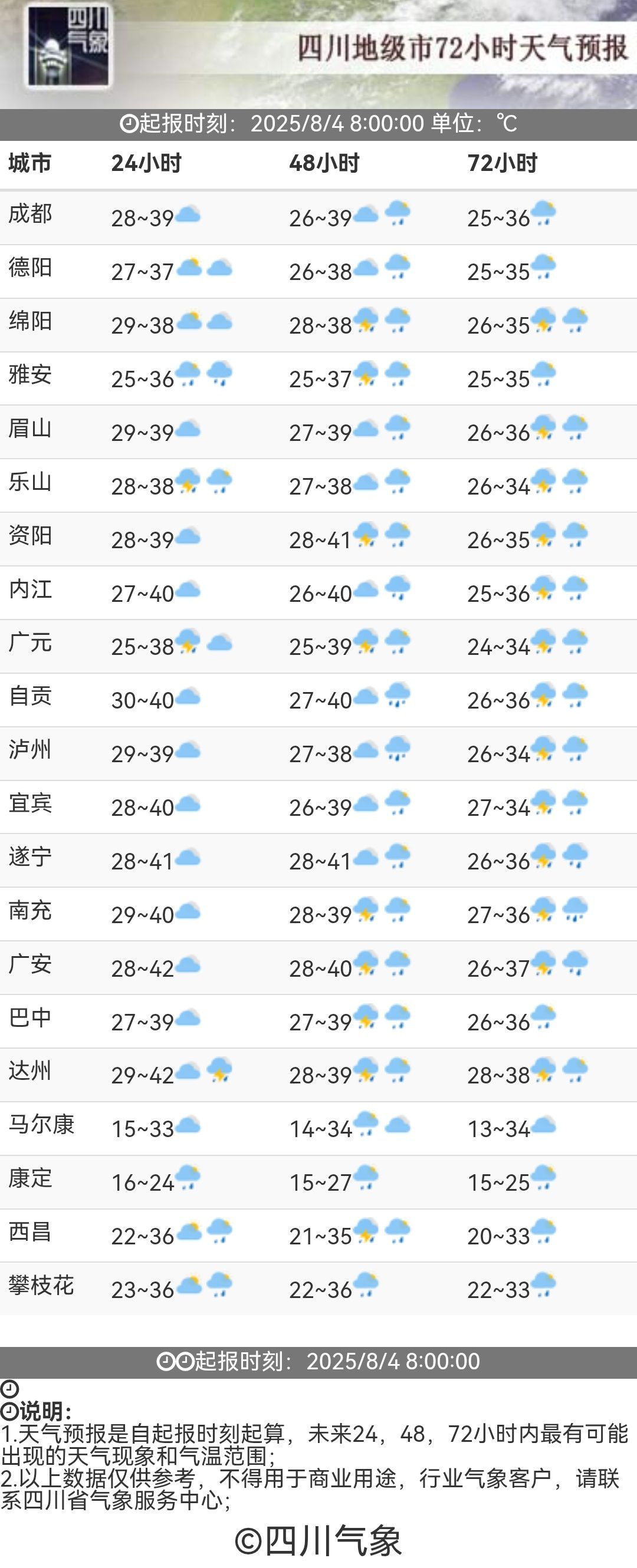 最新消息是:8月6日至7日,盆地大部有雨,雨量普遍中雨,局部大雨到暴雨;川西高原大部和攀西地区也有雨,局地中雨、个别大雨。四川省气象台预计,随着雨水的到来,8月6日,盆地最高气温将回落到34℃~36℃。