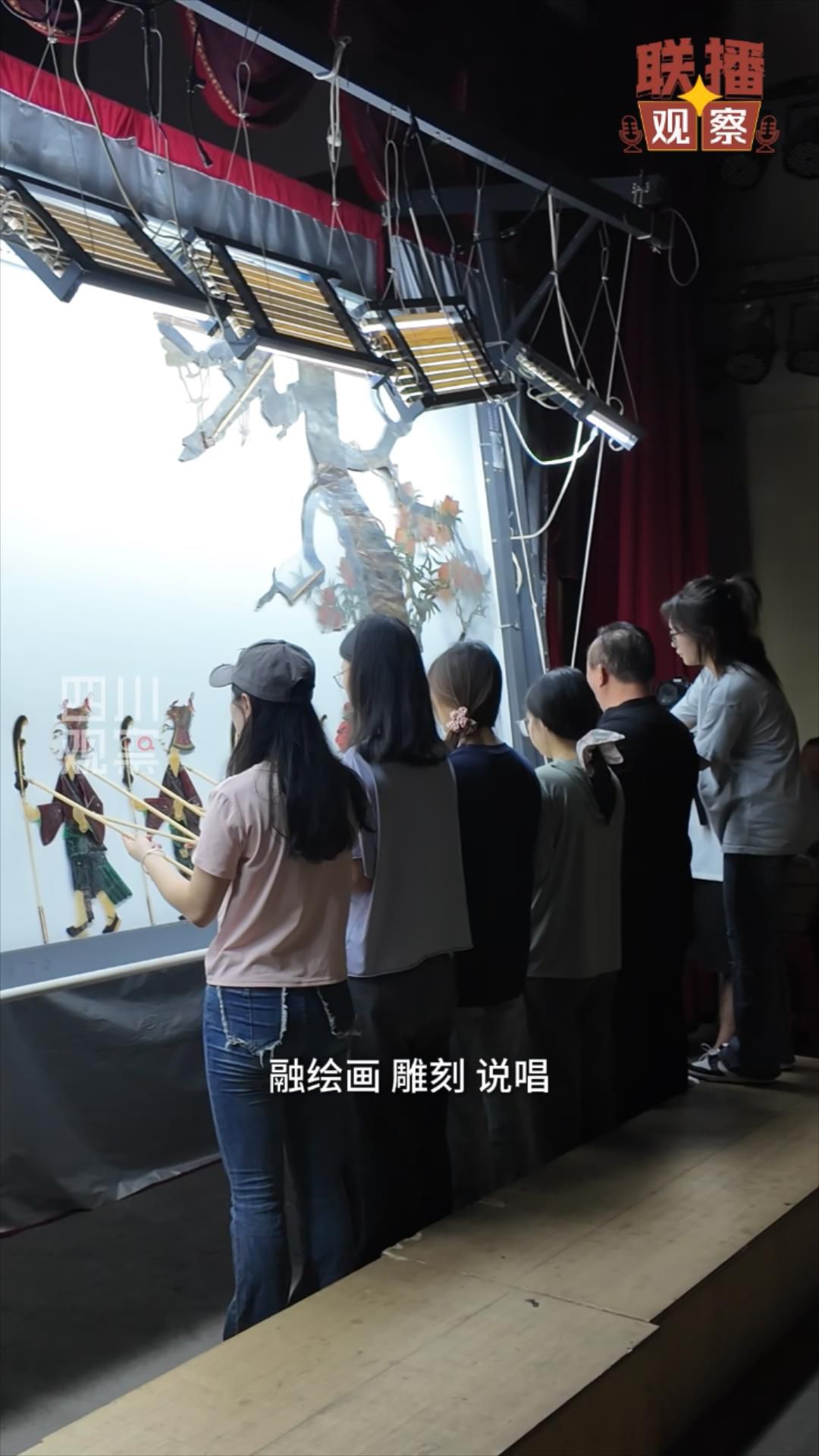王彪徒弟宋鸿雁举起自己模样的皮影向观观展示着:“我们现在有一个(皮影)迪斯科,是用来跳舞,像平时研学,他们会有小朋友到后面来体验,我们就会拿这些皮影给他们体验。”徒弟银丽、宋鸿雁等“90后”“00后”非遗新锐,既痴迷于钻研传统镂空雕刻技法,又大胆拥抱现代艺术表达,推动着古老的光影艺术不断向前发展。
