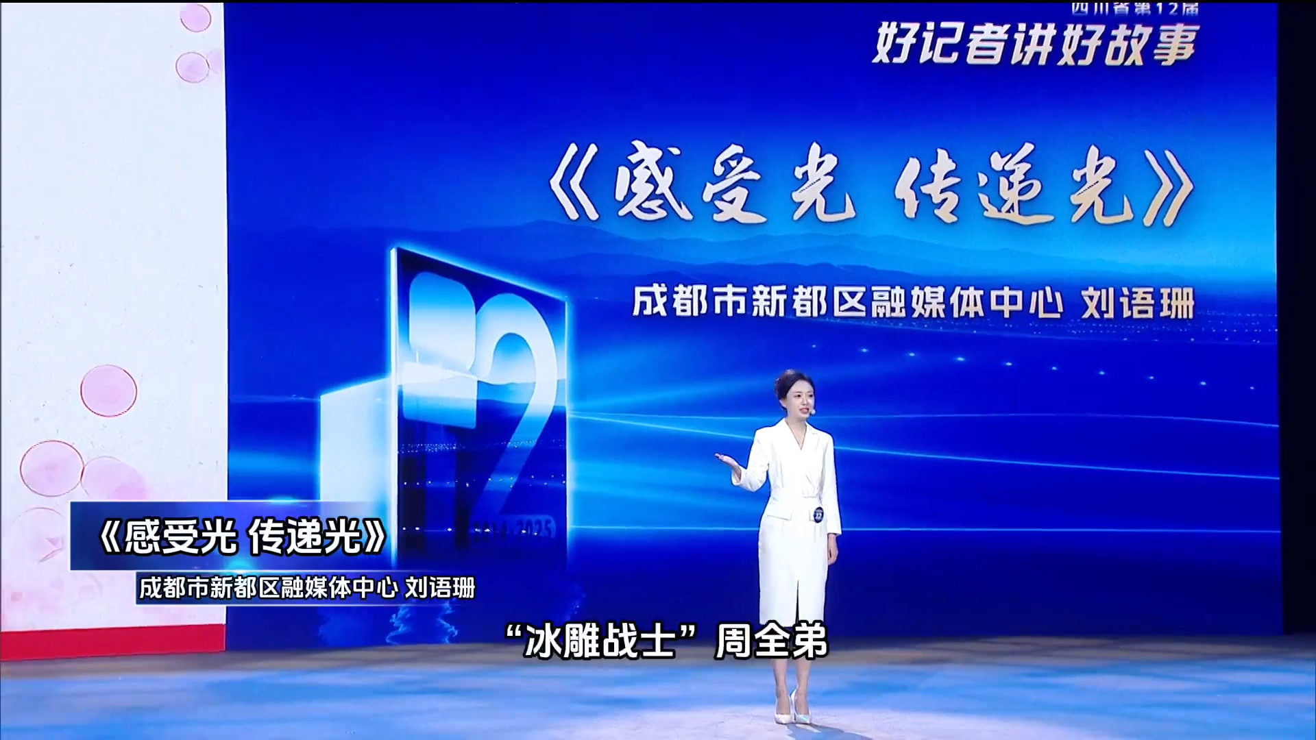 大家好,我是来自新都区融媒体中心的记者刘语珊,正如大家看到的,这是我第二次站上“好记者讲好故事”的舞台,上一次是2017年,那一次的比赛虽没取得很好的成绩,却给刚成为记者的我上了非常有意义的一课。之后的8年,我不停地收集着关于“好故事”的答案,今年也不例外。