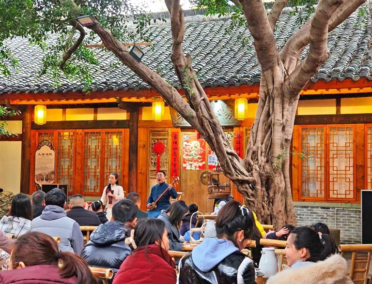 又一个周六下午,慵懒的阳光下,旗山书院内坐满了喝茶赏曲儿的观众。