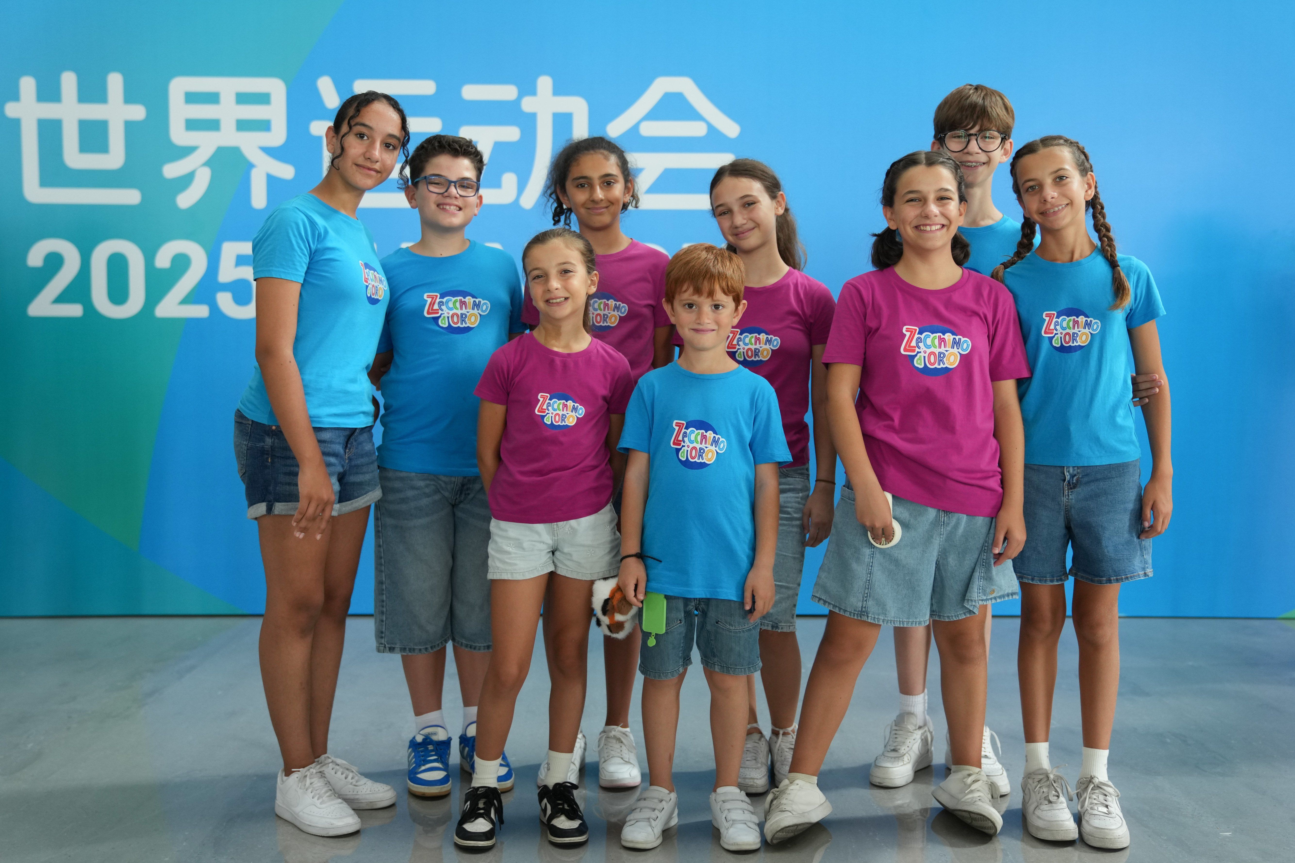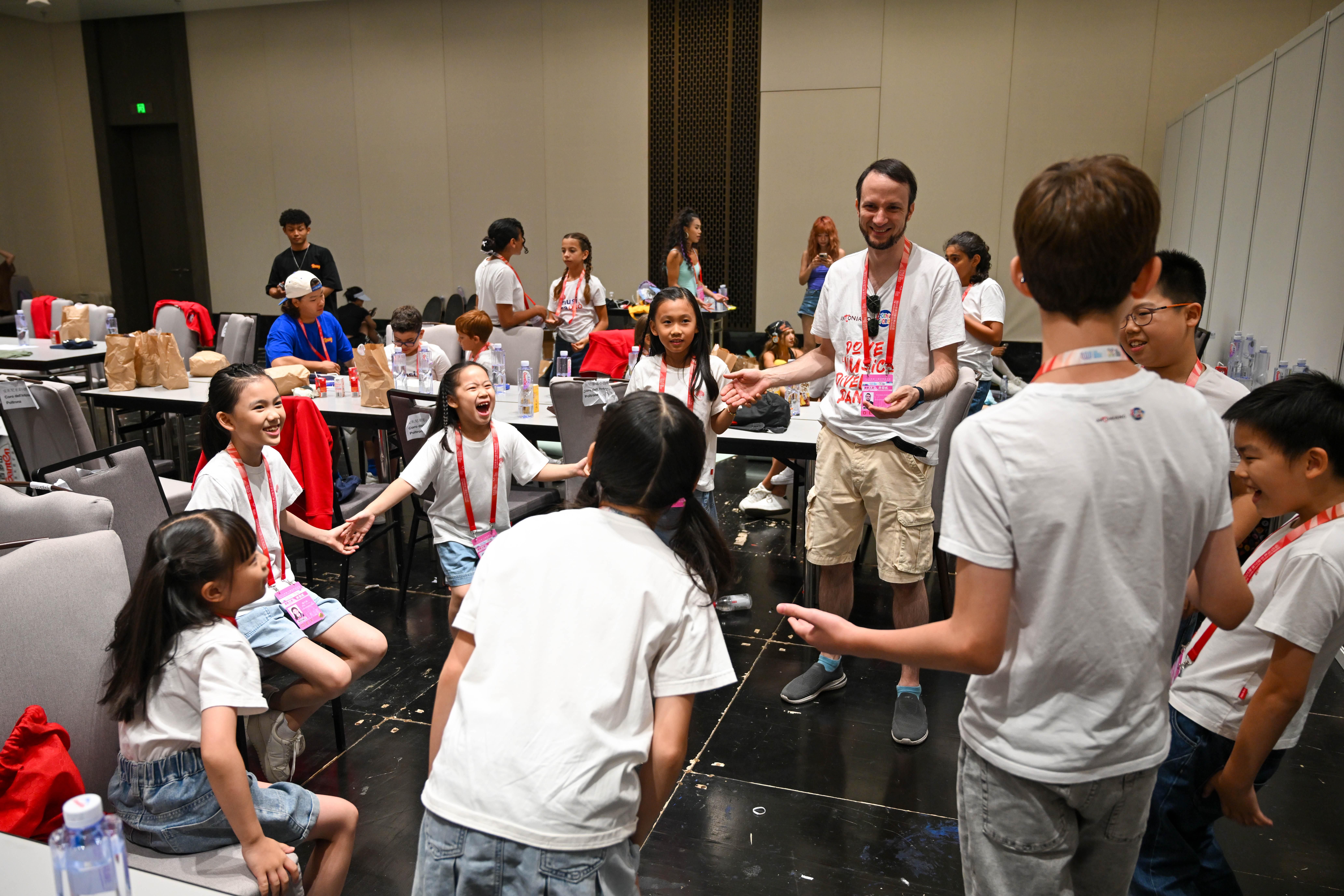 8月3日,上海绣球花小合唱团成员与意大利安东尼亚诺小合唱团成员在开幕式彩排前玩游戏。新华社记者胥冰洁摄