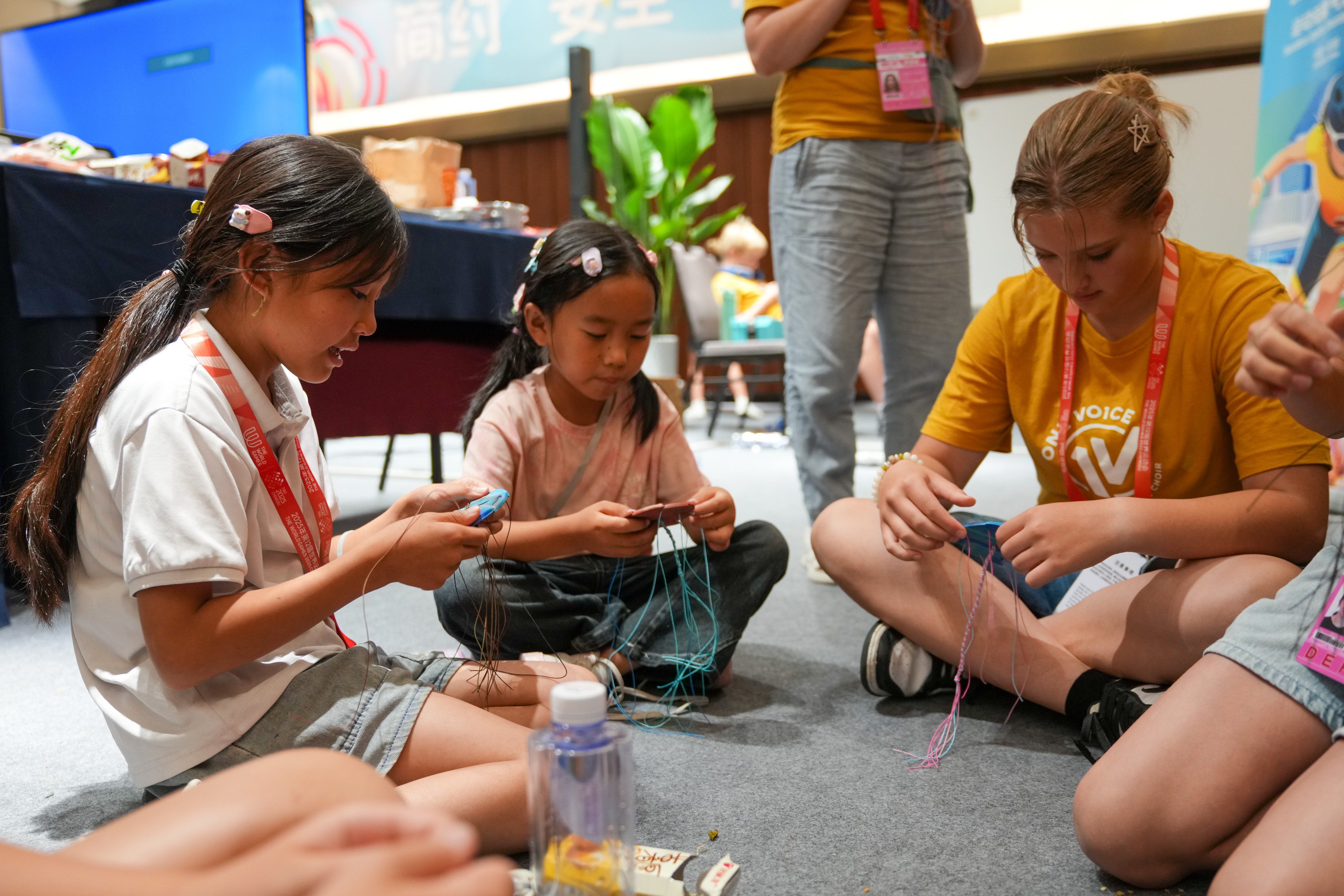 8月5日,大凉山妞妞合唱团成员王英(左)、阿毕子萱(中)和美国OneVoice成员奥特姆(右)在开幕式彩排前一起编制手链。新华社记者胥冰洁摄