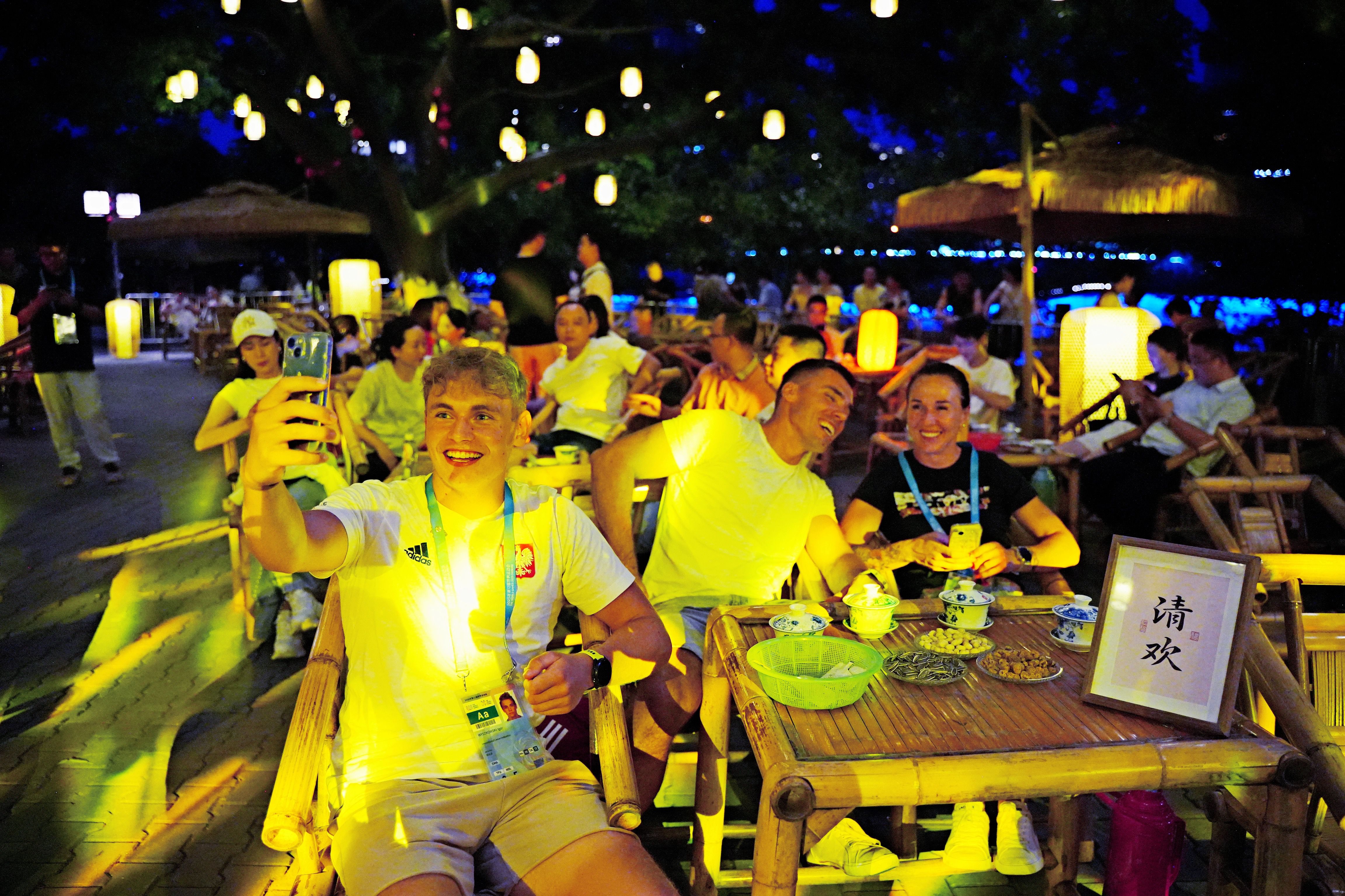 8月6日晚,几名成都世运会运动员、教练员与裁判员登上火锅巴士,解锁“吃着火锅,看烟火成都”新体验。来自荷兰的体操技巧评判员鲁道夫一边涮着肥牛,一边举着手机记录车外的夜景,“这种感觉太奇妙了!”尝了一口红糖糍粑后,更是让他感慨:“成都就像这道甜点,热情里藏着温柔。”