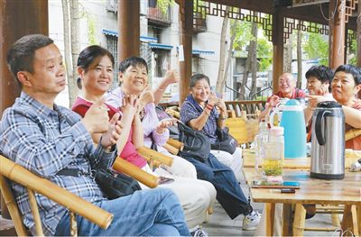 居民在改造后的杏园饮茶聊天。王钦玉摄