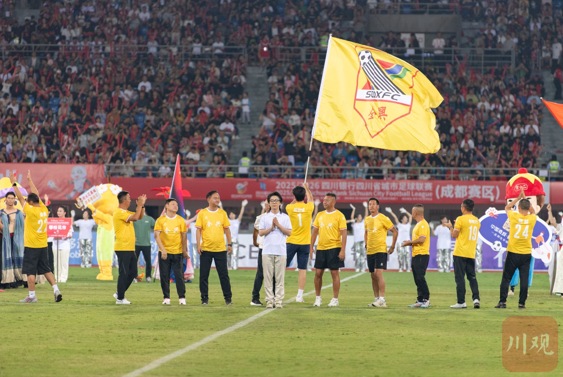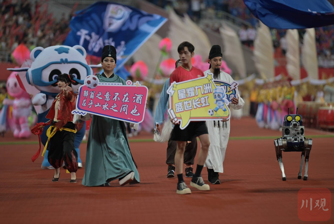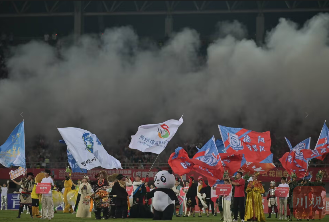 当晚,成都太阳神鸟和遂宁陈子昂以及德阳三星堆、绵阳李白、内江张大千、广元武则天、雅安大熊猫、甘孜野牦牛、自贡恐龙等文旅元素集体亮相……这既是一场绿茵场上“为家乡荣誉而战”的全民足球赛事,更成为一场热情与活力共融、古韵与今辉交织的“锦绣天府·安逸四川”文旅盛会。