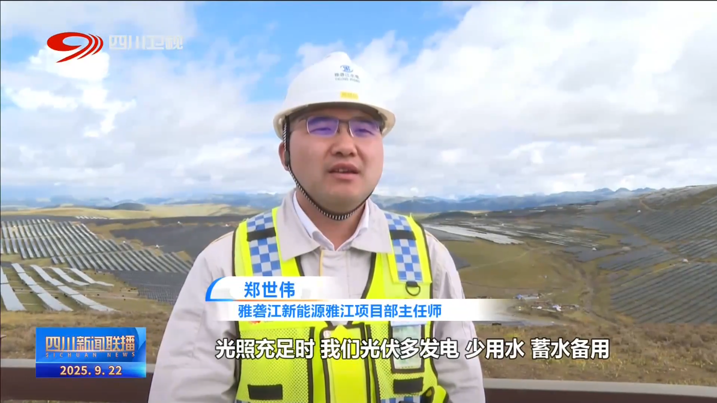 雅砻江新能源雅江项目部主任师 郑世伟: 光照充足时,我们光伏多发电、少用水,蓄水备用,阴雨天气光伏出力不足的时候,水电会迅速补充,通过水光智能协同,稳定输出优质绿电,每年可以减少二氧化碳排放约160万吨,相当于植树约9000万棵,或抵消一个中型城市全年碳排放量。