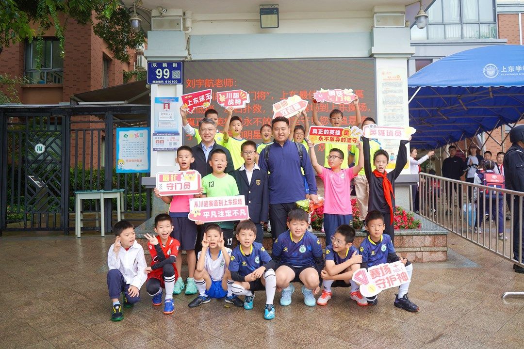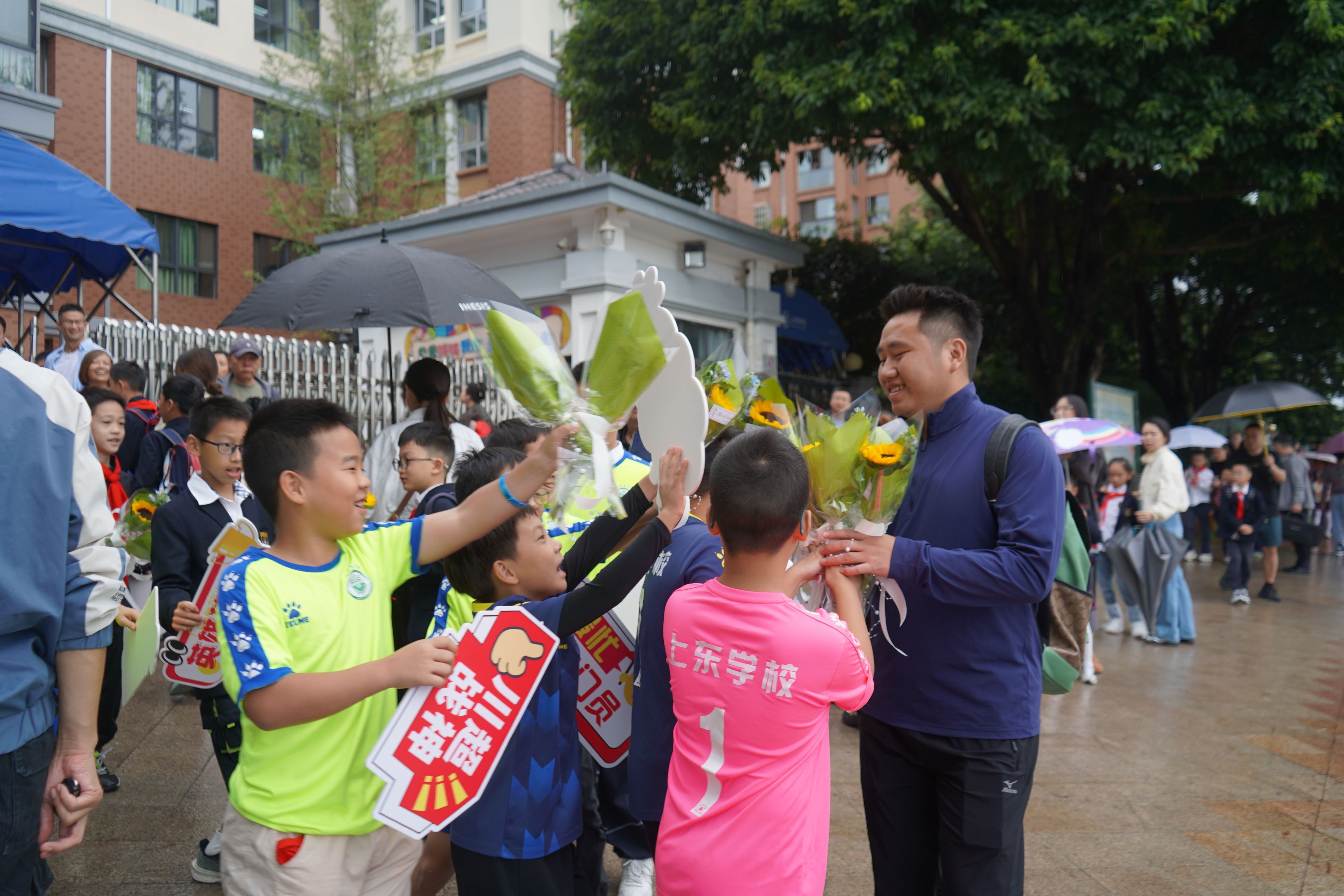 9月22日,身为成都上东学校体育老师的刘宇航回到学校,受到了全校师生的热烈欢迎,迎接他的不仅有鲜花和掌声,还有一个特别的礼物——一副守门员手套,鼓励他在“川超”继续顽强拼搏,为孩子们树立榜样,为遂宁队守住荣誉。