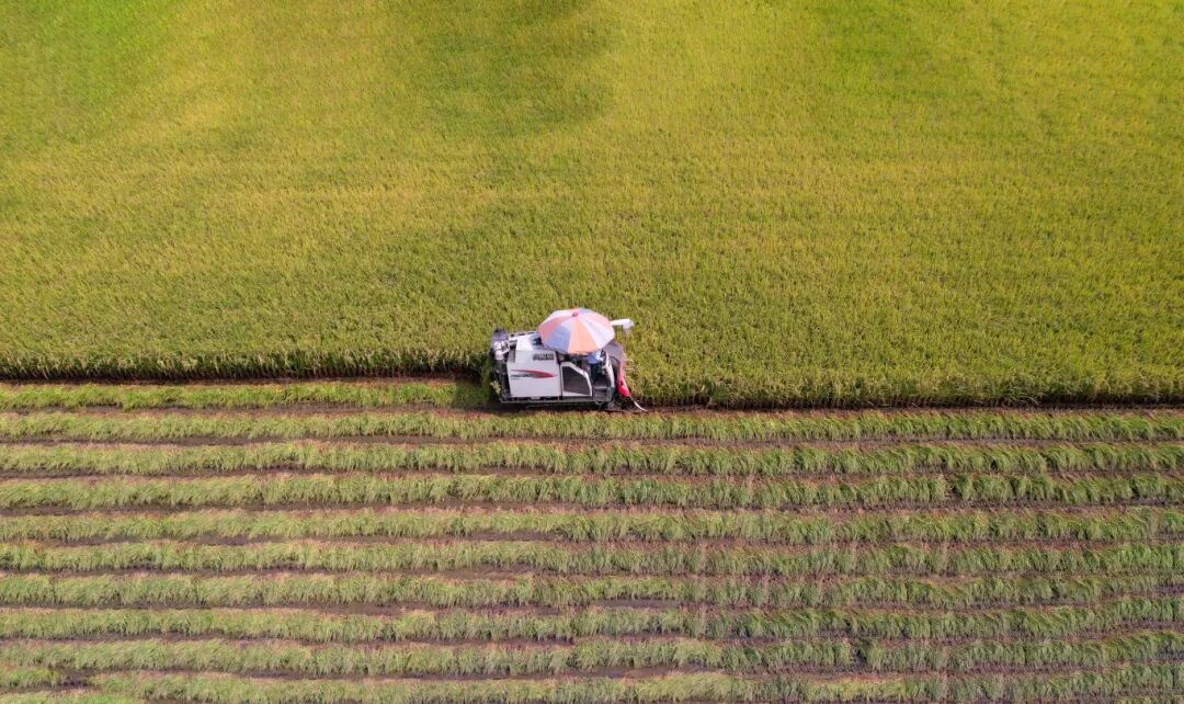 在太和镇永丰村,同样一派丰收的忙碌景象。数台收割机在高标准稻田里来回穿梭。