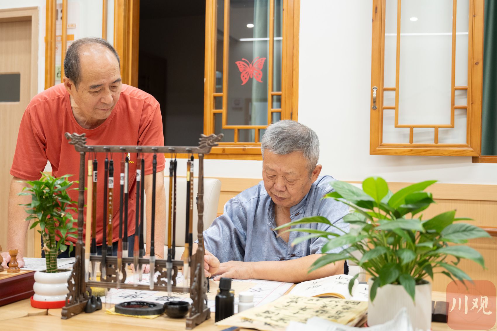 成都市金牛区营门口街道综合为老服务中心,老人在练习书法。