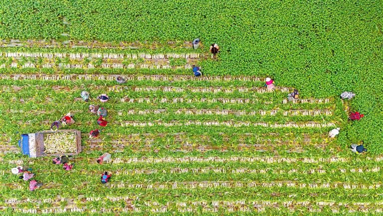 船山区老池镇渝遂绵优质蔬菜生产带船山基地核心区内,村民正在采收、打包萝卜供应市场。全媒体记者 吴奉家 摄