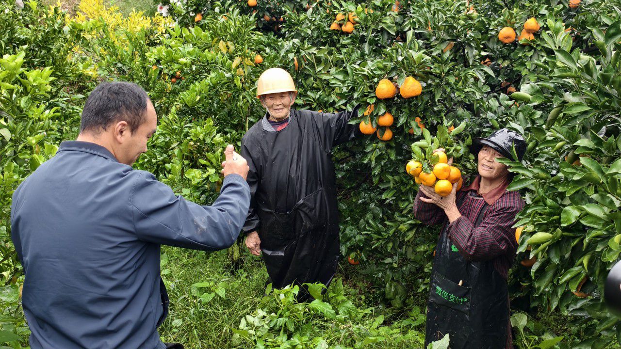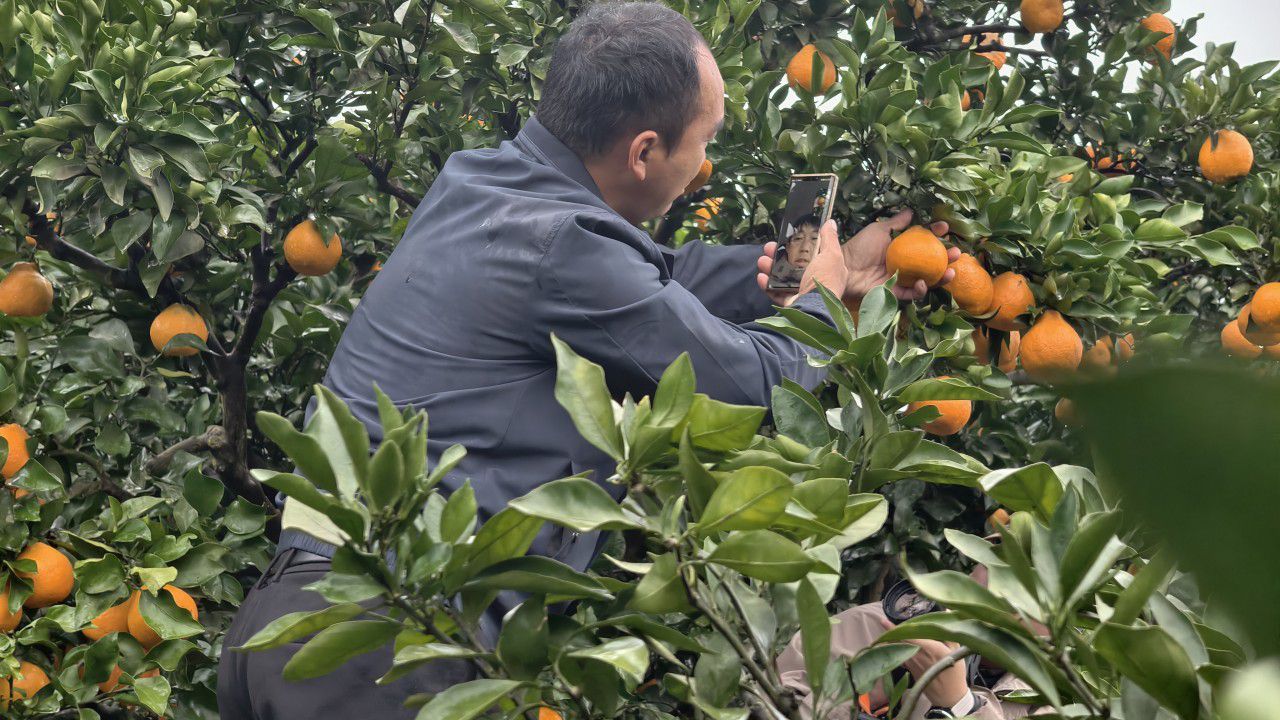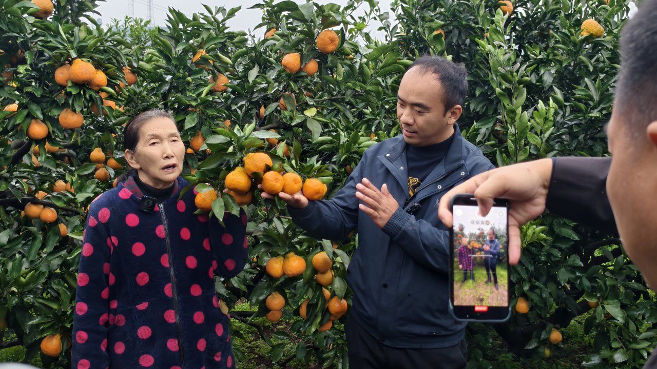 找机位、捋台词,团队成员迅速拿起手机开拍。镜头前,罗泽底气十足地推介:“这里是丰裕镇半月村12组,蜜柑果形周正、硬度够、无浮皮,品质上乘,欢迎各地客商前来采购!”为了让宣传更接地气、更有说服力,他特意邀请杨婆婆出镜“代言”,老人捧着果子也大方展示:“你看这颜色好漂亮,果子又硬扎,味道甜得很!”