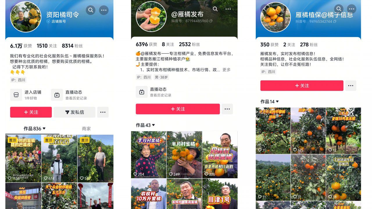 怀揣着这份初心,罗泽带领团队走遍了丰裕镇同意村、长沙村、敲钟村、人乐村等十几个村落。除了“资阳橘司令”账号外,他们又陆续注册“雁橘发布”“雁橘植保”“刘橘长”等6个抖音号扩大影响力,累计发布实地实拍宣传短视频200多个,只要搜索“雁江蜜柑”,总能刷到他们在田间地头忙碌的身影。
