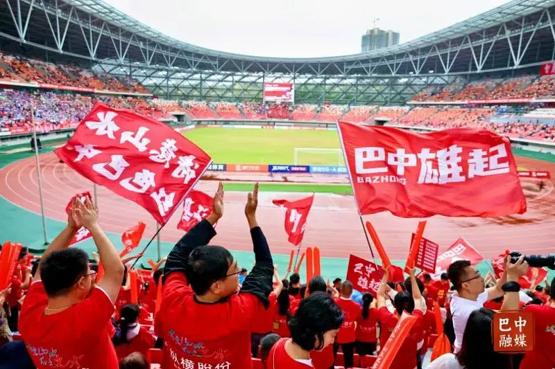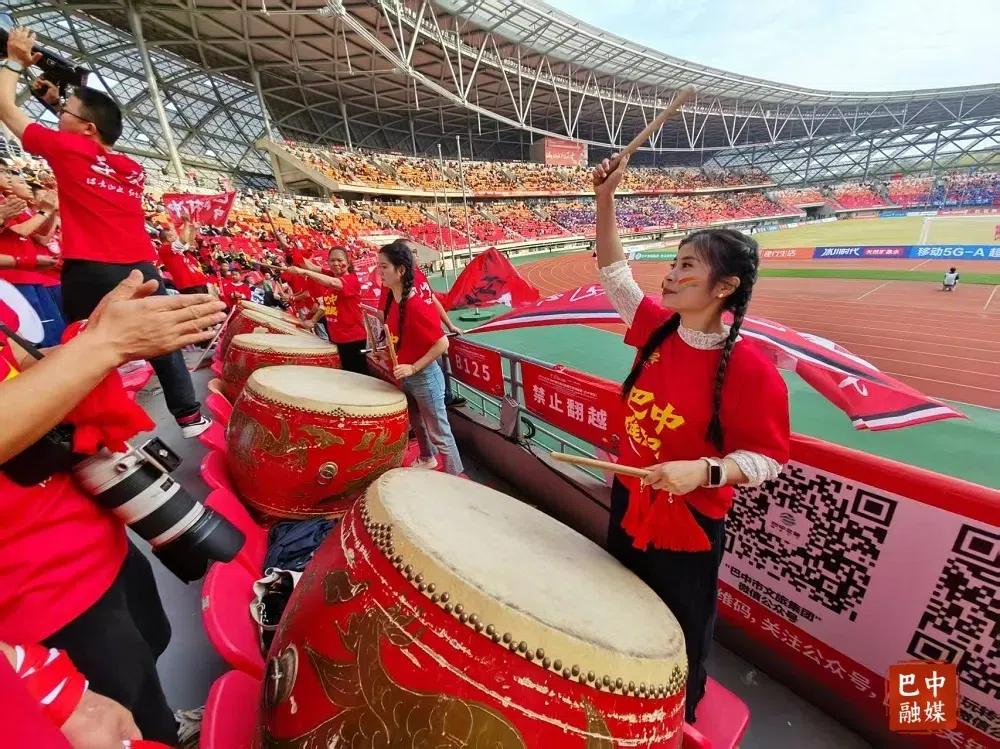 10月12日,巴中红叶队主场迎战达州川汉子队,巴中球迷方阵高举红色“巴中雄起”应援牌。