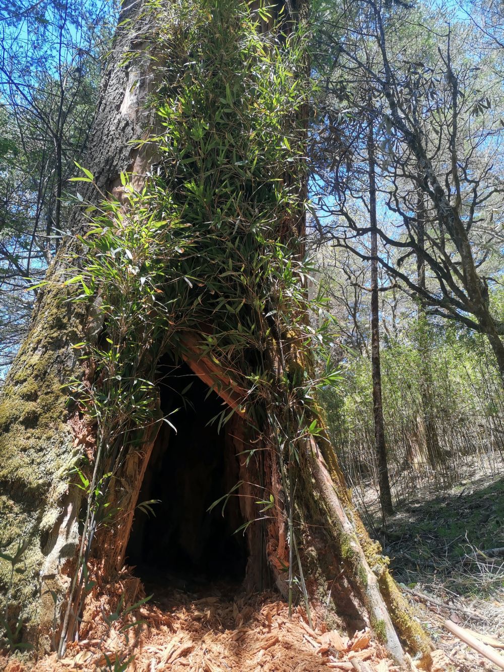 “这样能增加大熊猫到访洞穴的几率。”韦伟解释道。这棵两人合抱才能将树干围住的云杉树,是韦伟团队精心修葺的大熊猫的“家”。此前天然形成的树洞空间较小,他们便扩大了洞穴面积,并将木屑、枯叶垫在洞底。