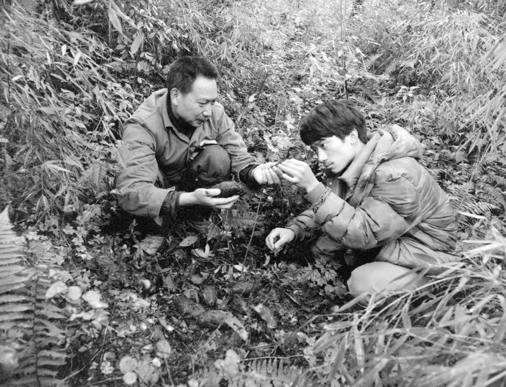 胡锦矗(左)和时任“五一棚”监测站负责人王鹏彦(右)一起分析大熊猫的粪团,寻找它们的活动踪迹,以准确地投放补充饲料。新华社记者 金勖琪 摄