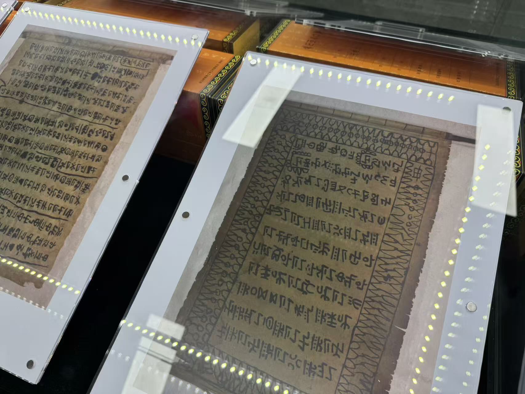 存放在展示柜中的彝文古籍复印件。